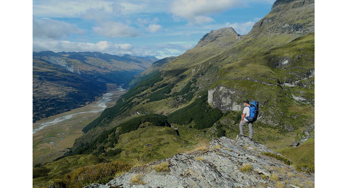 Finding the route down through bluffs. Mount Aspiring is on the skyline right of centre
