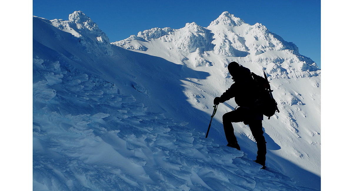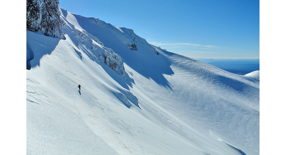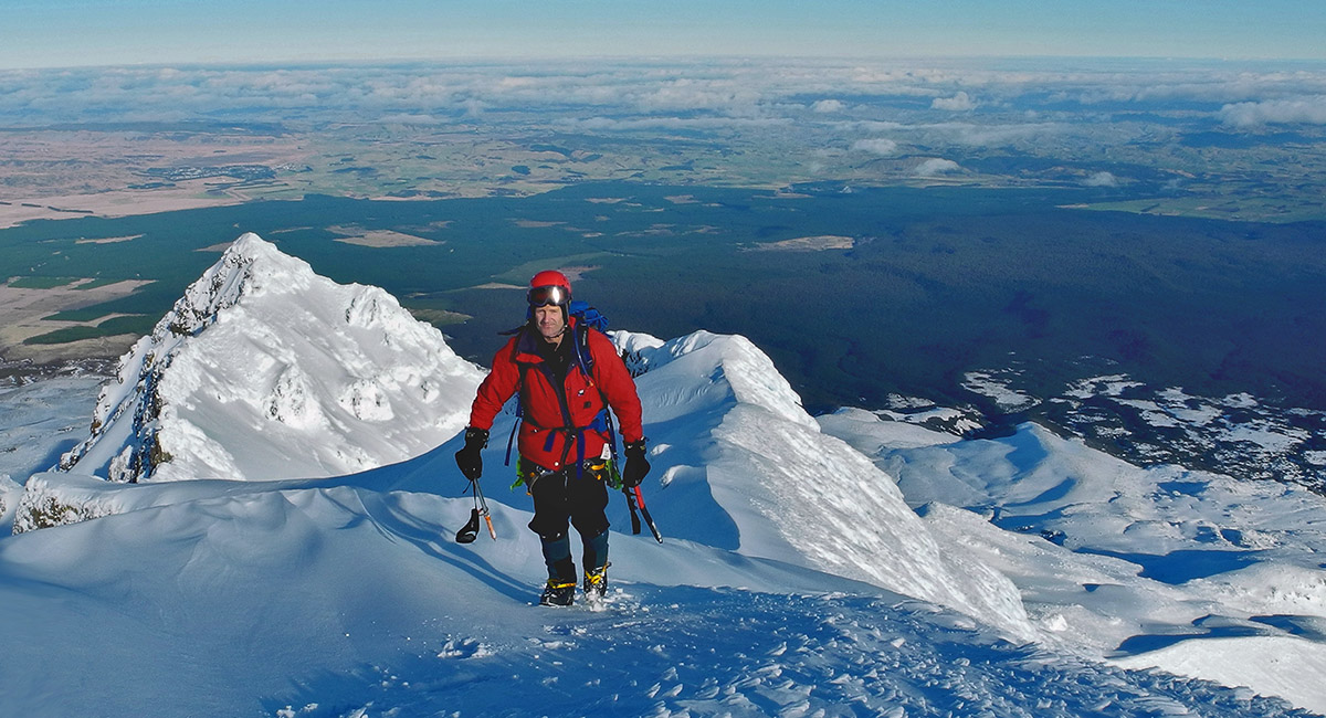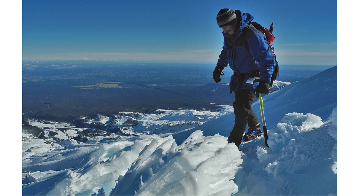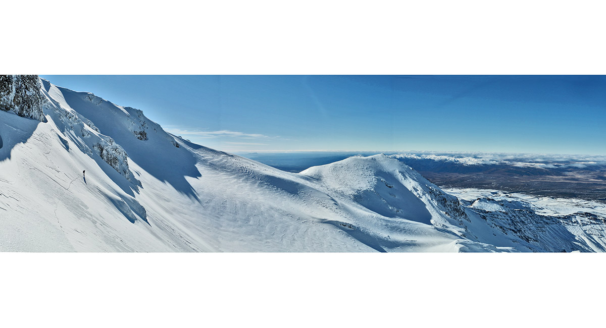 Climbing above Turoa ski field, with Mount Taranaki on the horizon