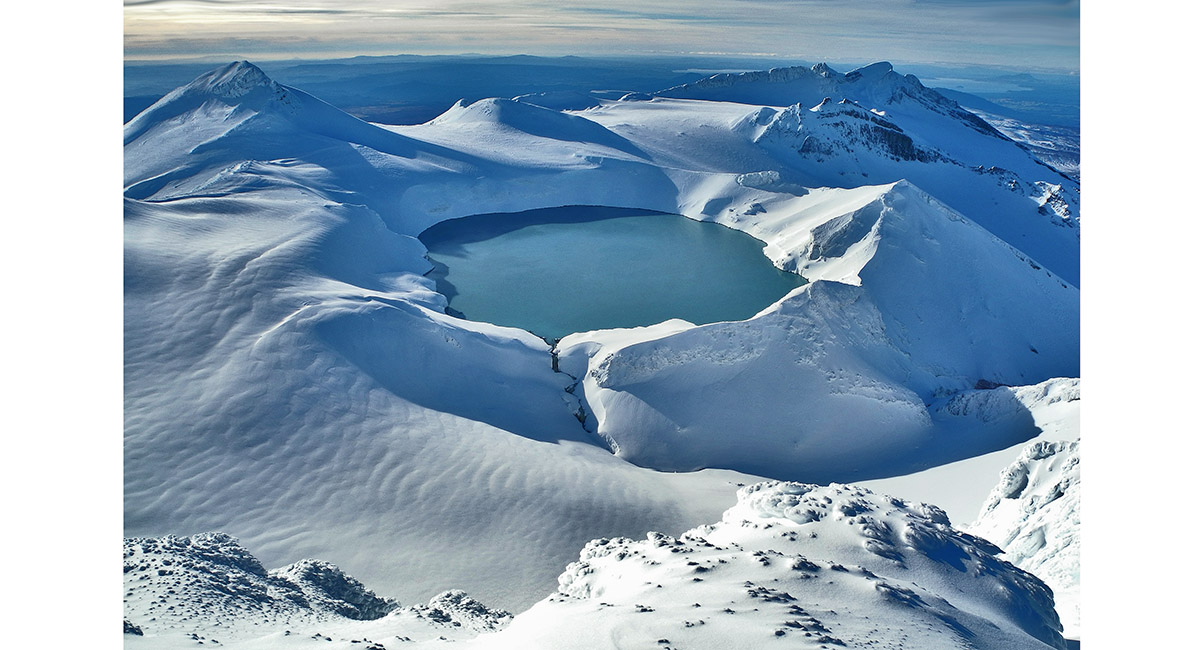 View from the summit of Tahurangi (2,797m), looking north to the Crater Lake. Right of the lake is Pyramid Peak (2,645m), then Cathedral Rocks (2,663m), then Tukino (2,720m) and Te HeuHeu (2,732m). Paretetaitonga (2,751m) is left of the lake
