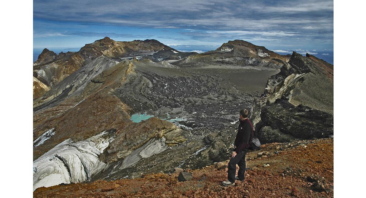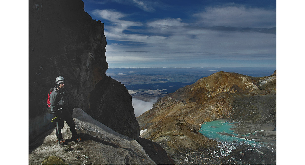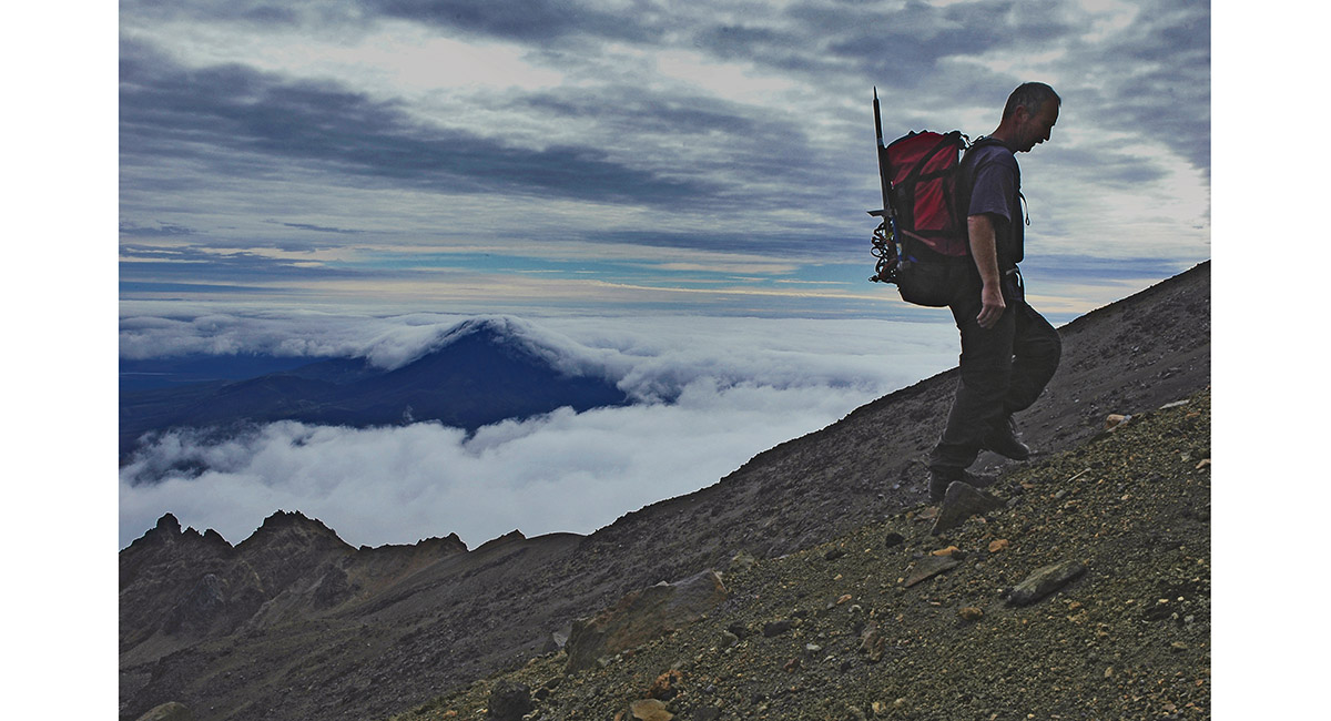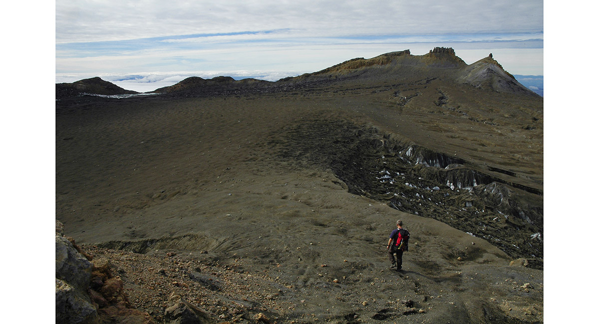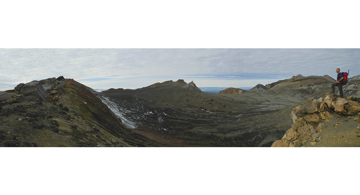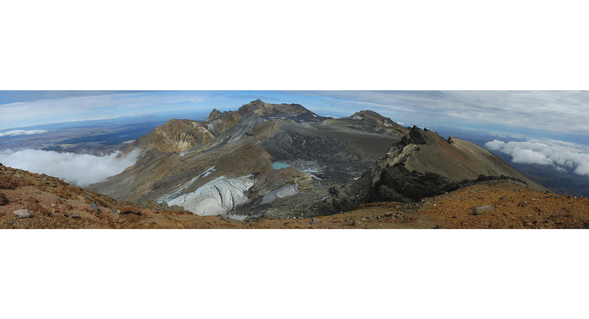 Above Whakapapa ski field at about 2,350m, looking north to the Pinnacles in the foreground, with Ngauruhoe behind