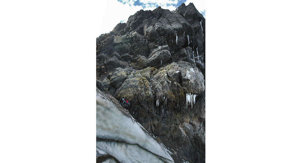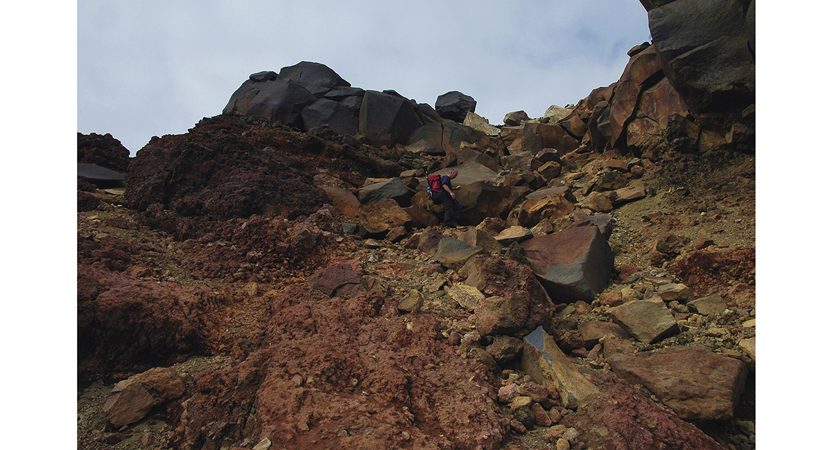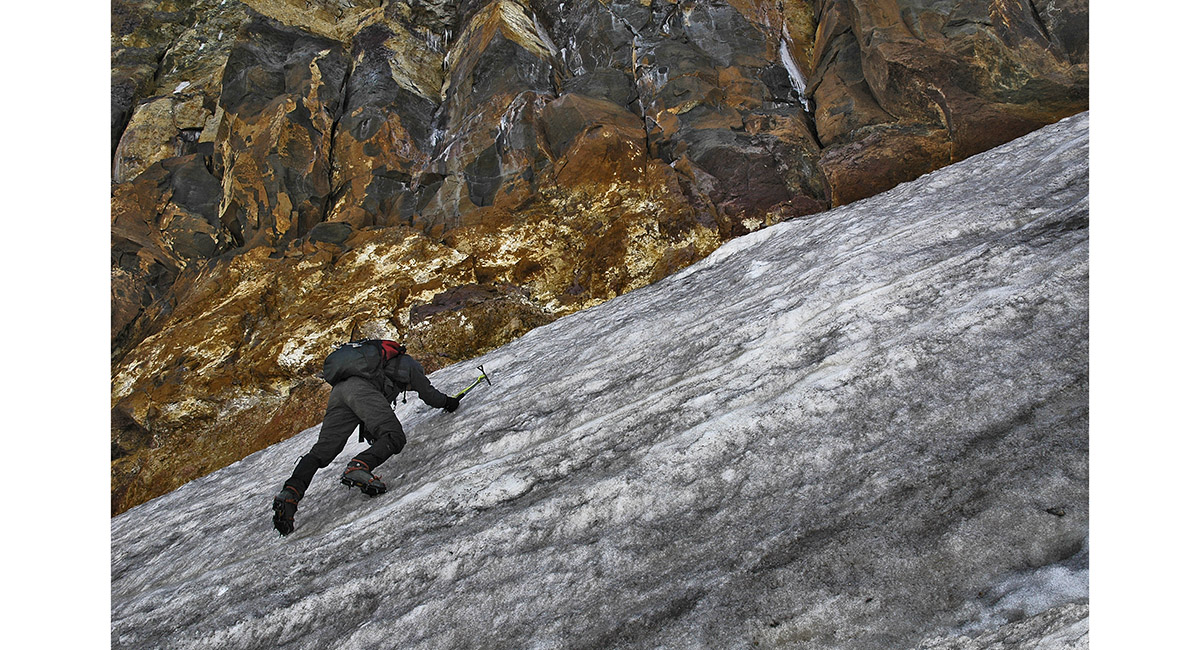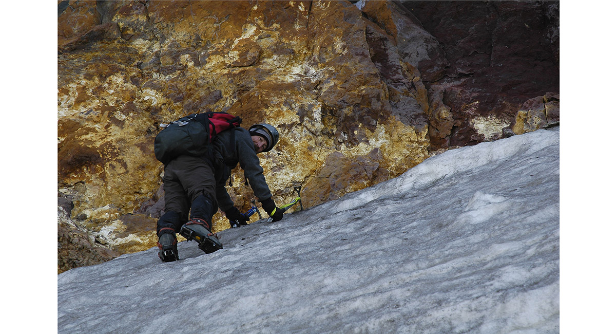 Approaching the base of the crux - a steep little crumbling rock section exposed to the ice wall below. In winter this is just an easy plod up in crampons