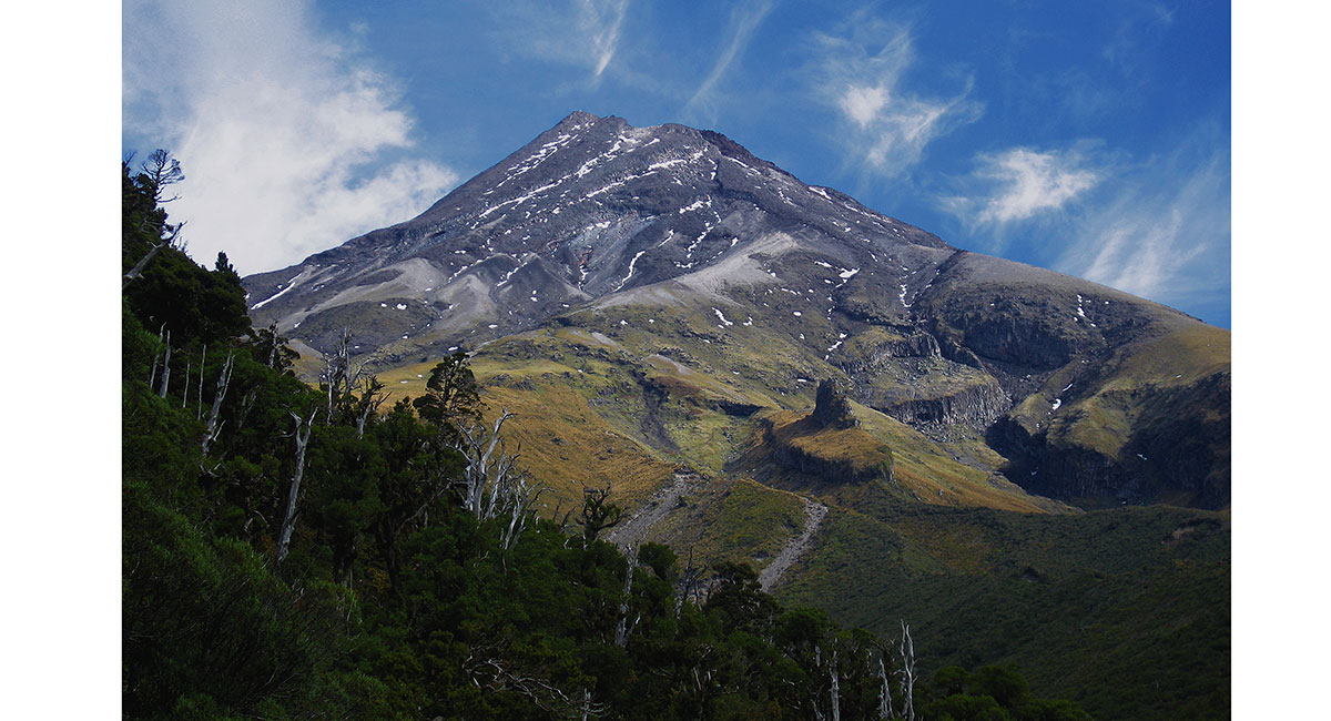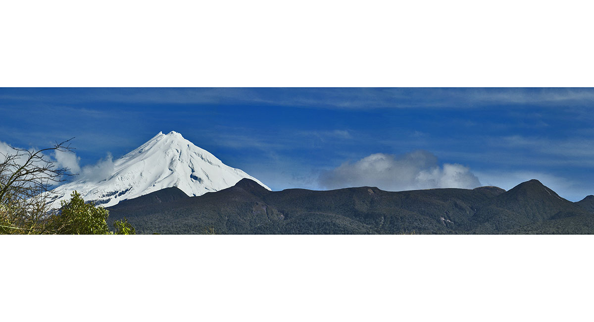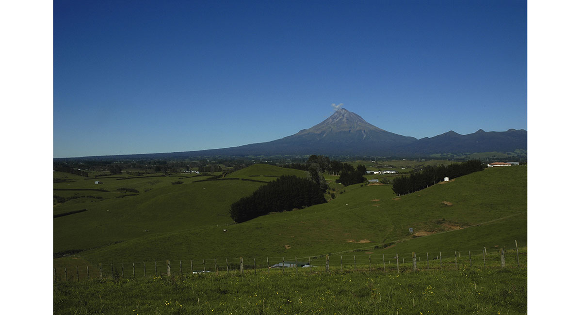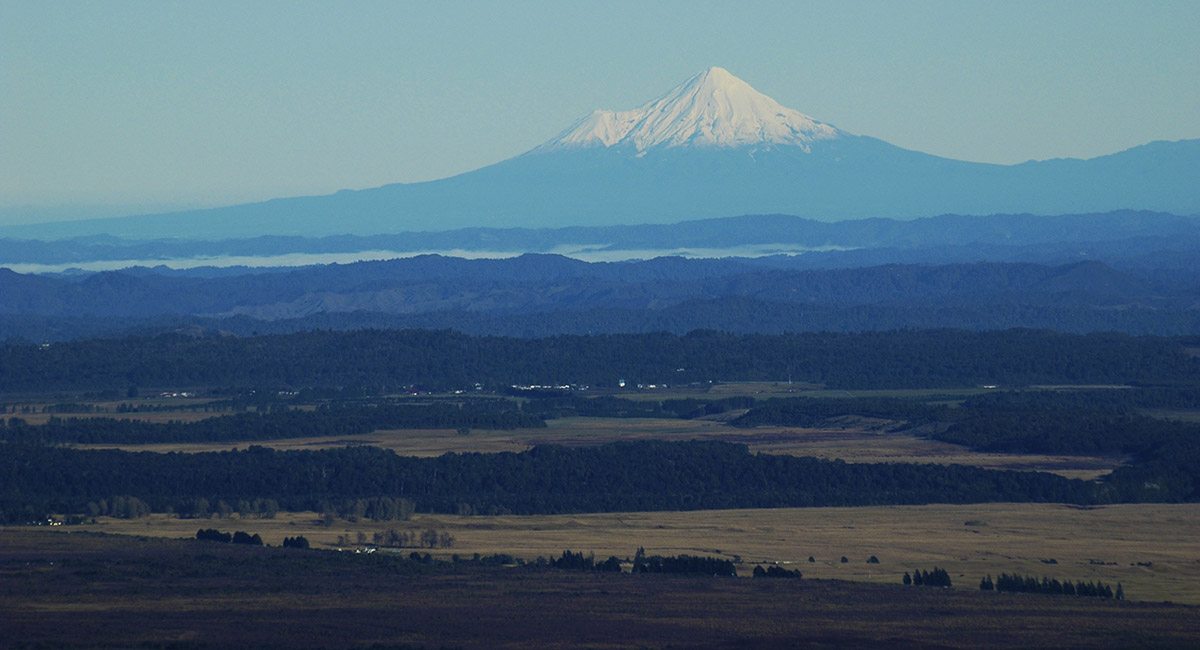 Mt Taranaki viewed from the northwest, with Mts Ruapehu and Ngauruhoe behind