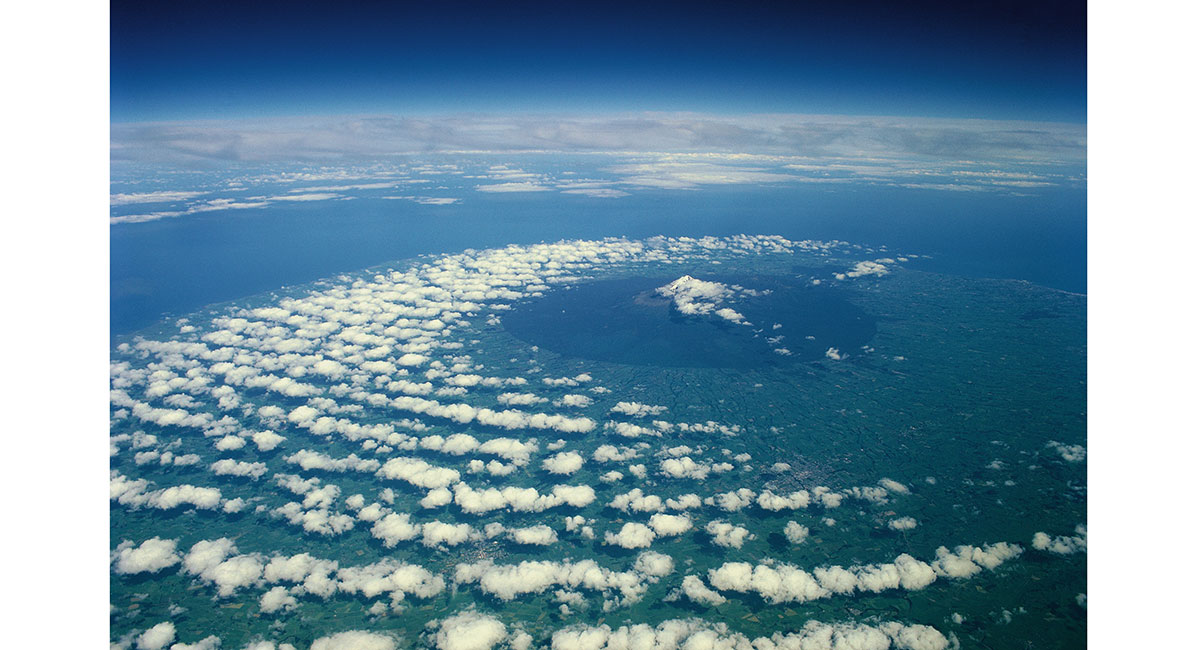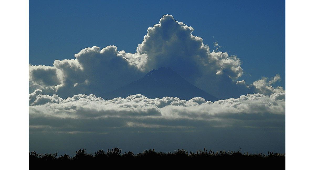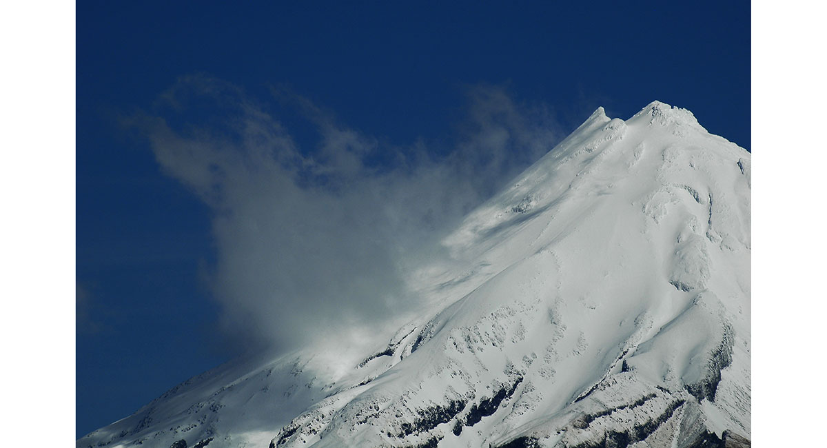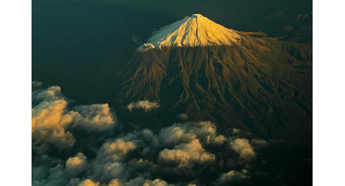 Mt Taranaki viewed from the northwest, with Mts Ruapehu and Ngauruhoe behind