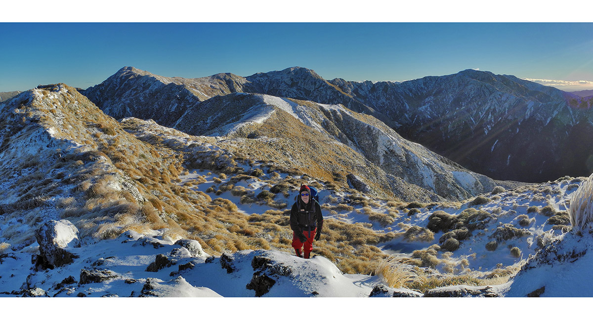 A closer look at the Broken Axe Pinnacles from McGregor. Being alone, I was not game to tackle the exposed broken ridge right across. Even the poled route to the right side of the steepest section of ridge required hanging off handfuls of snowy tussock above quite big dropoffs