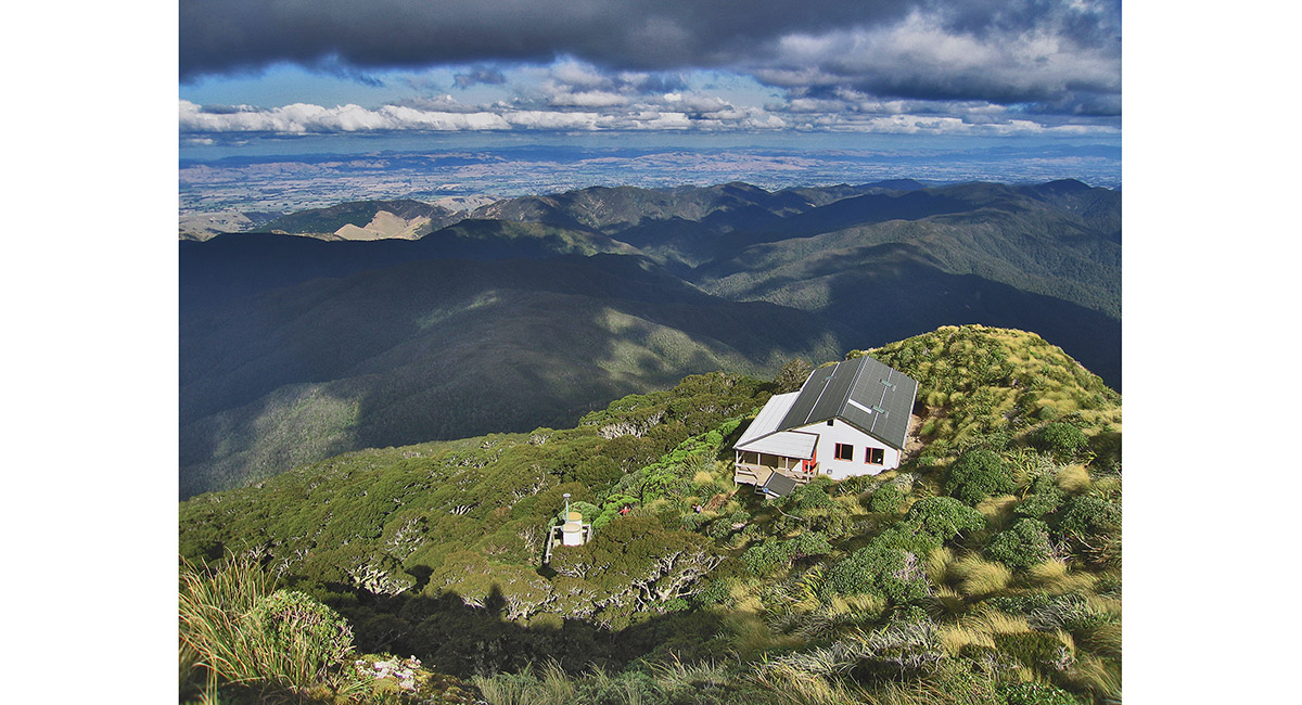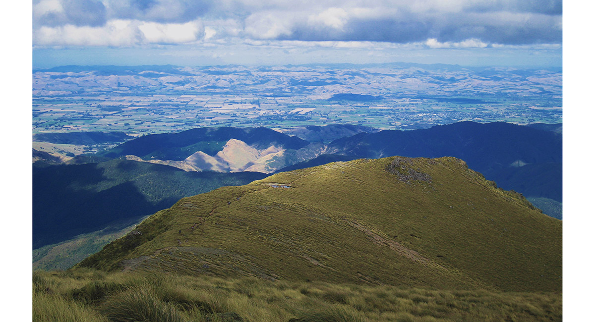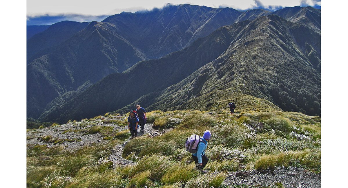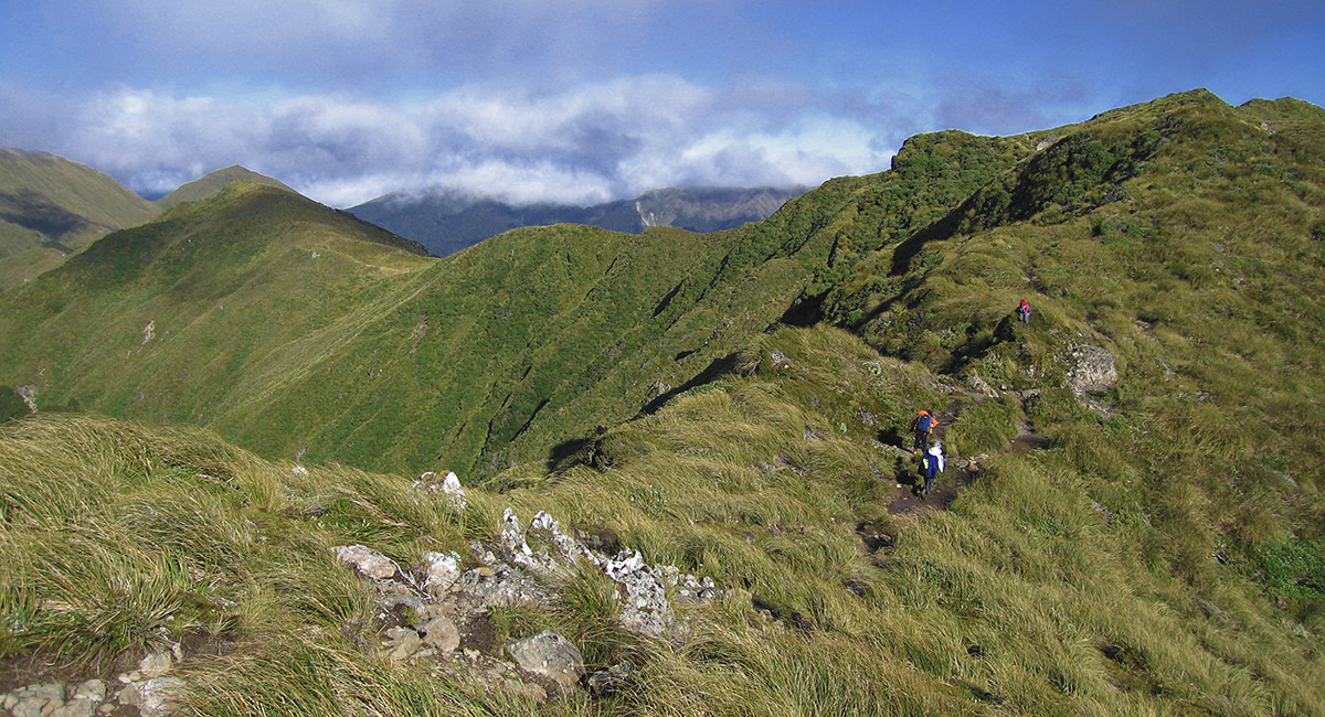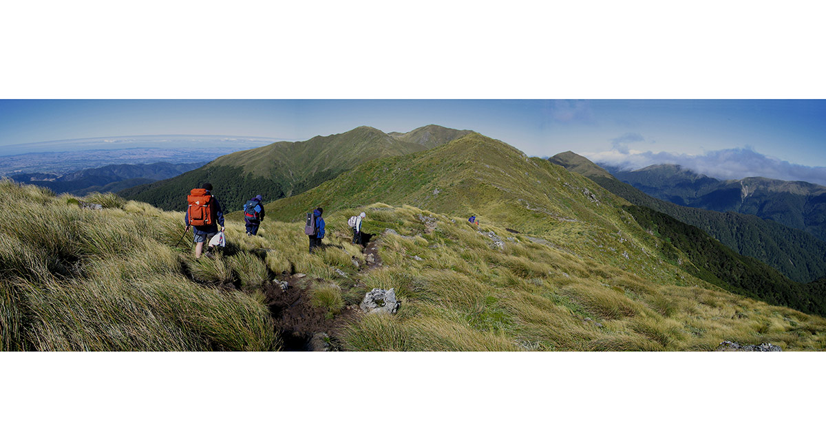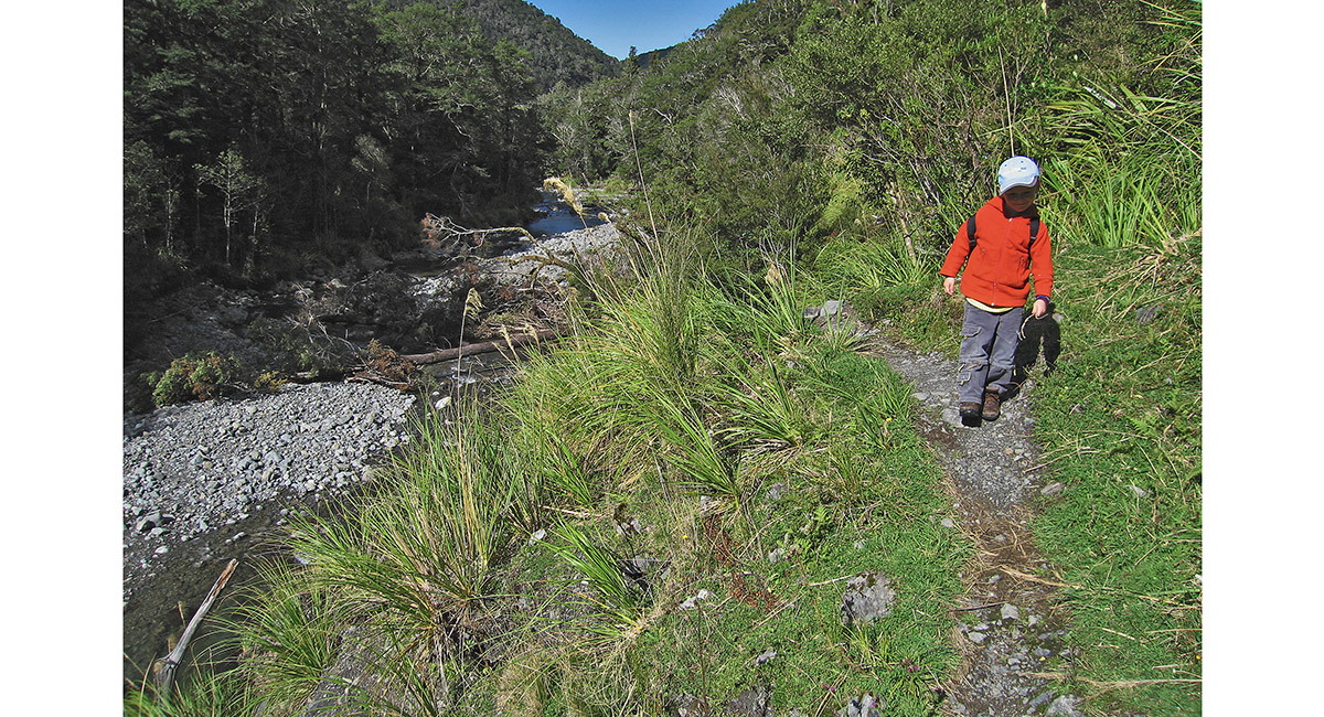 On the trail below Powell Hut at the bush line, looking southeast, down the Atiwhakatu Valley