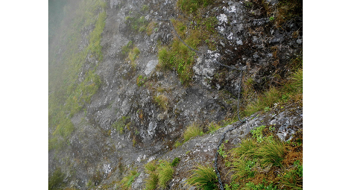 Chains at the base of the Ladder, leading around to Maungahuka (1,330m). In whiteout conditions this exposed section can be quite disorienting