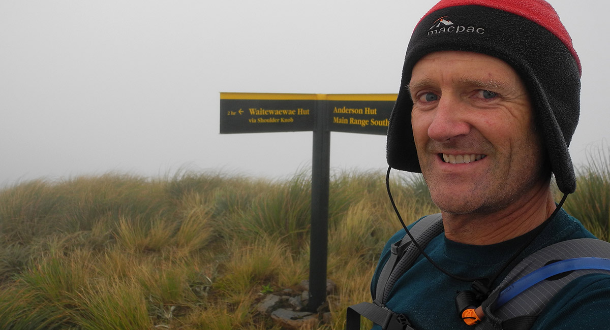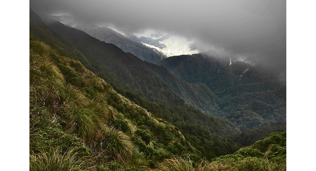 Heading north to Kahiwiroa (1,320m). I became benighted north of here, after failing to find the route down off the ridge to Anderson Memorial Hut before nightfall. Better to stay put than take the wrong spur, of which there were several to choose from, down into dense bush. While the route is cairned, it's easy to lose them on the wide, rocky, eroded ridge top.