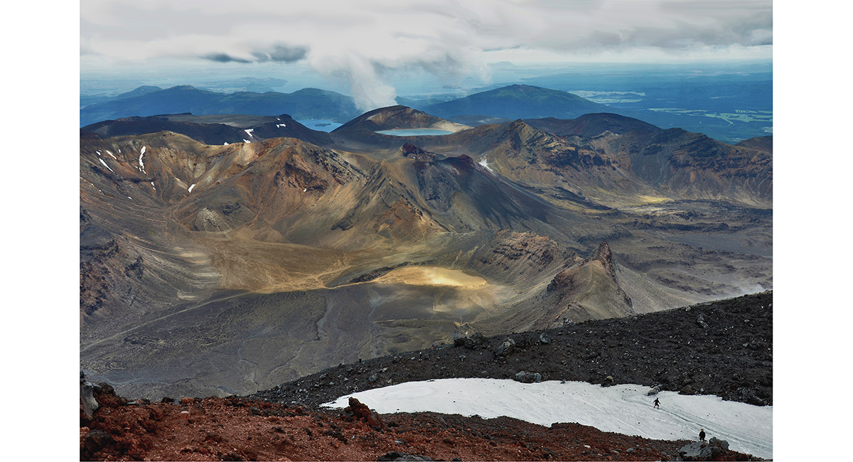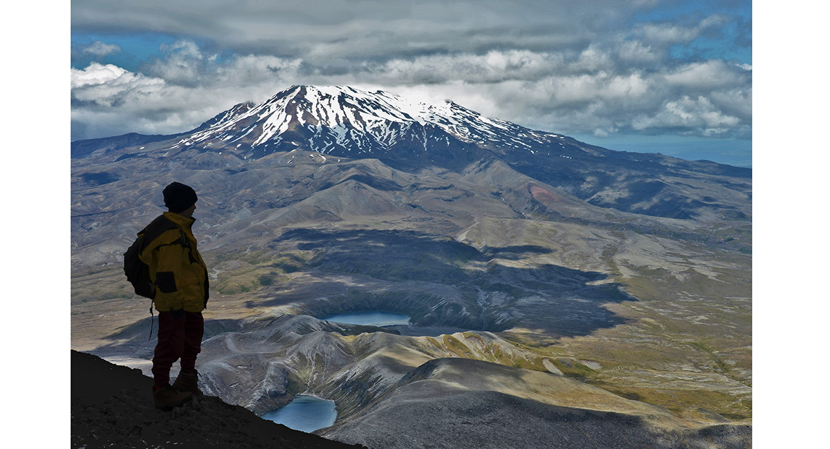 View from the southern rim of Ngauruhoe, with the Tama Lakes below and Mount Ruapehu