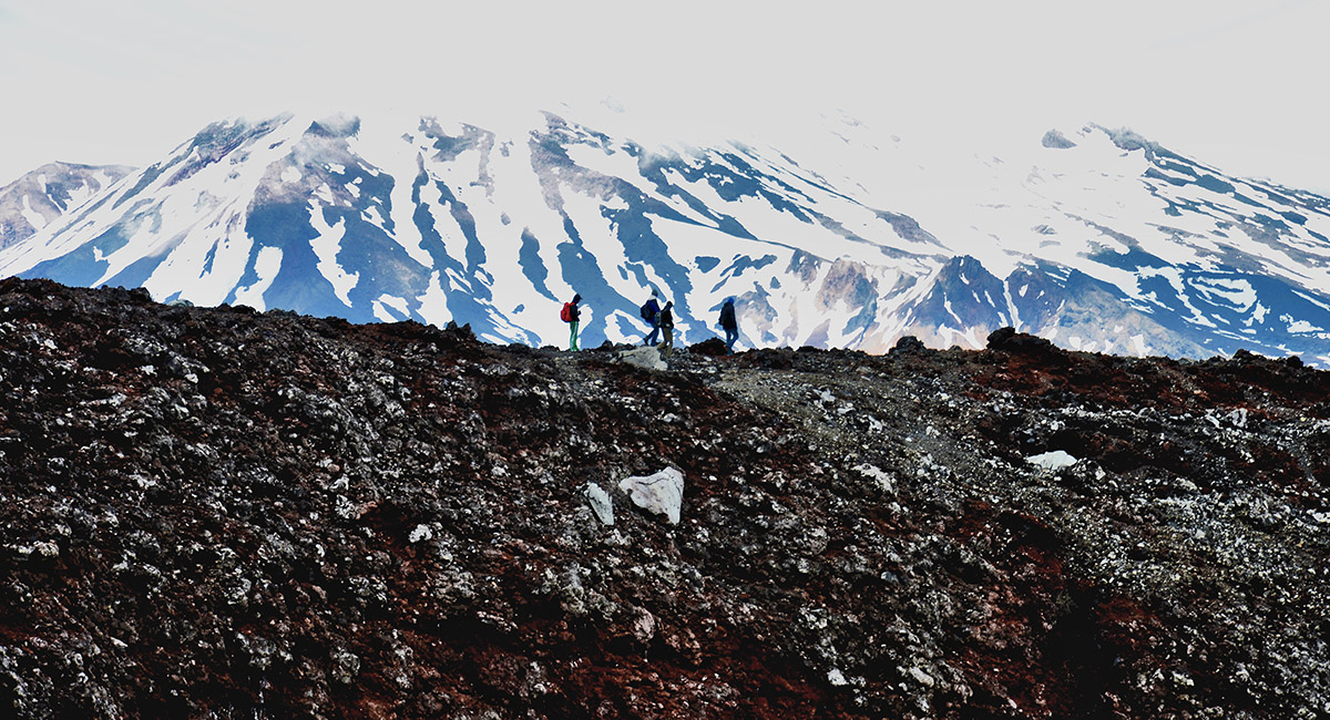 Climbers on the southern rim of Mount Ngauruhoe (2,278m), with Mount Ruapehu (2,797m) behind