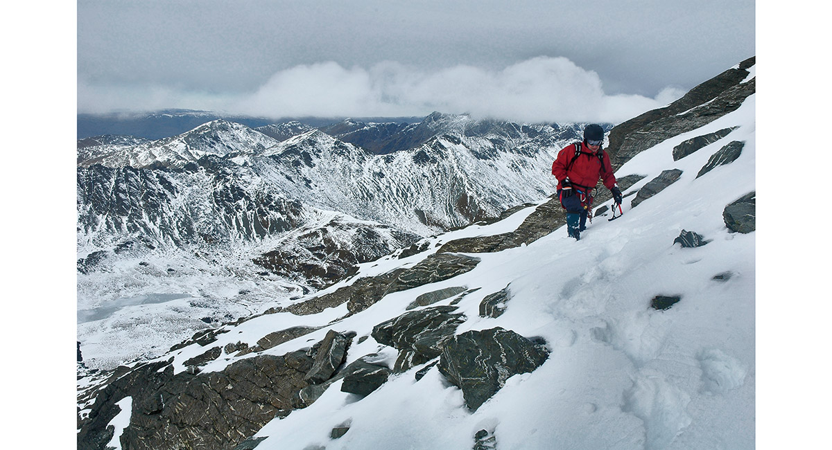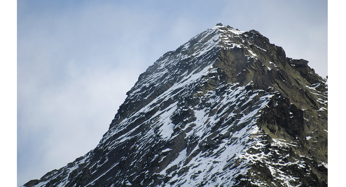The summit of Single Cone (2,319m). Downward sloping slabs covered in patchy unconsolidated snow prevented us from reaching the summit on this day in May 2008