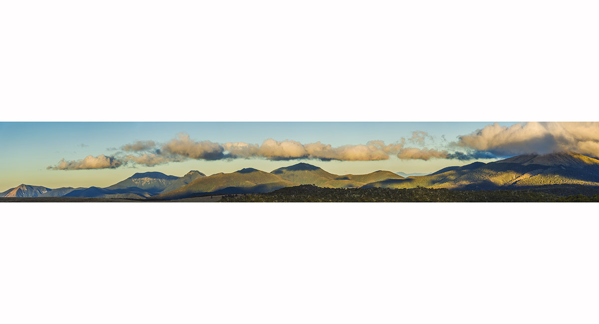 Dusk panorama near Balloon Hut, from Gordons Pyramid (far left) to Mt Owen (in cloud)