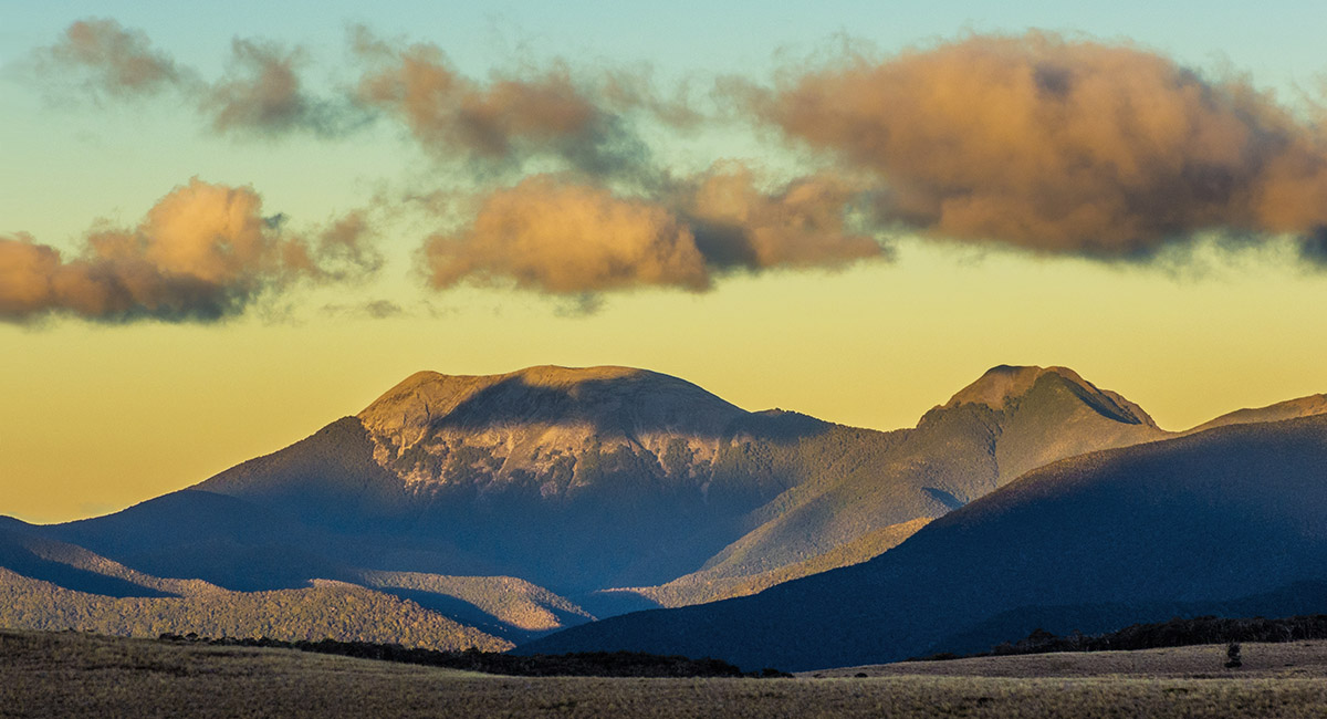 Gordons Pyramid (1,489m, left) and Mt Arthur, from near Balloon Hut at sunset