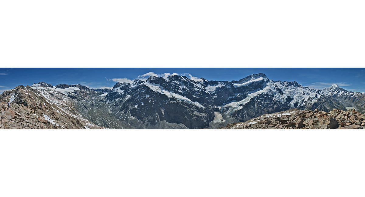 From left, Mt Sefton, the Footstool and Aoraki Mt Cook, from the summit of Mt Ollivier