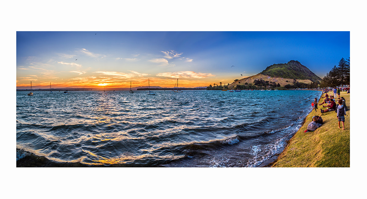 Mount Maunganui and Tauranga Harbour at sunset, New Zealand