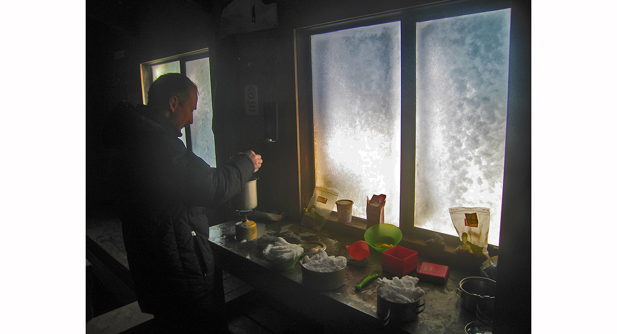 Inside an ice encrusted Syme Hut, Fanthams Peak, Mt Taranaki