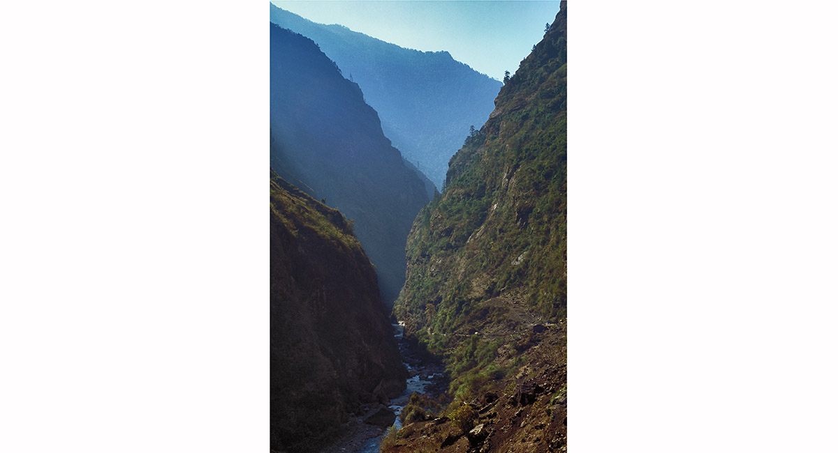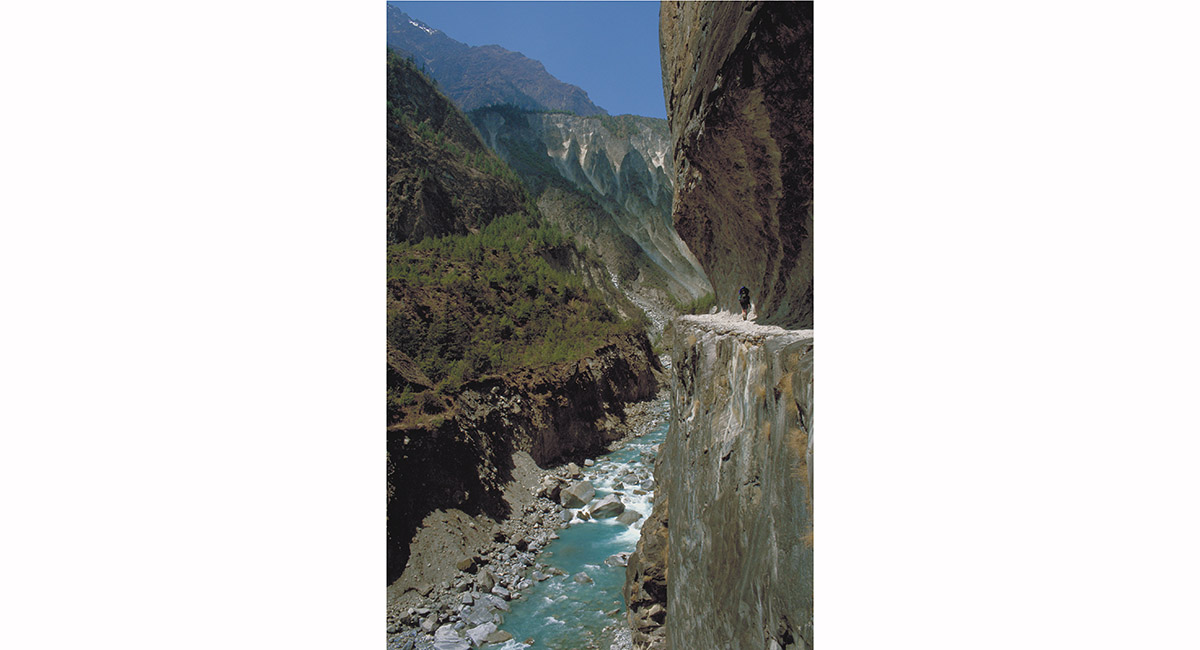 Above Chame, a portion of the trail is hewn from solid vertical cliff faces – very spectacular to tread and vastly easier than trying to follow the broken path of the Marsyangdi Khola below
