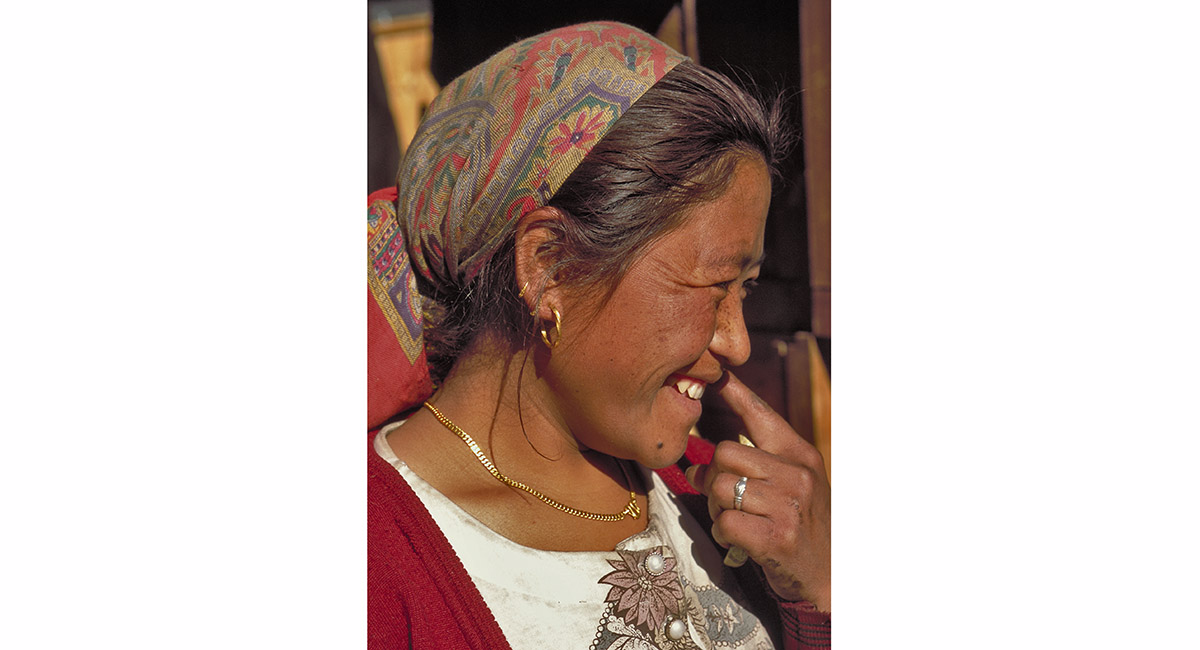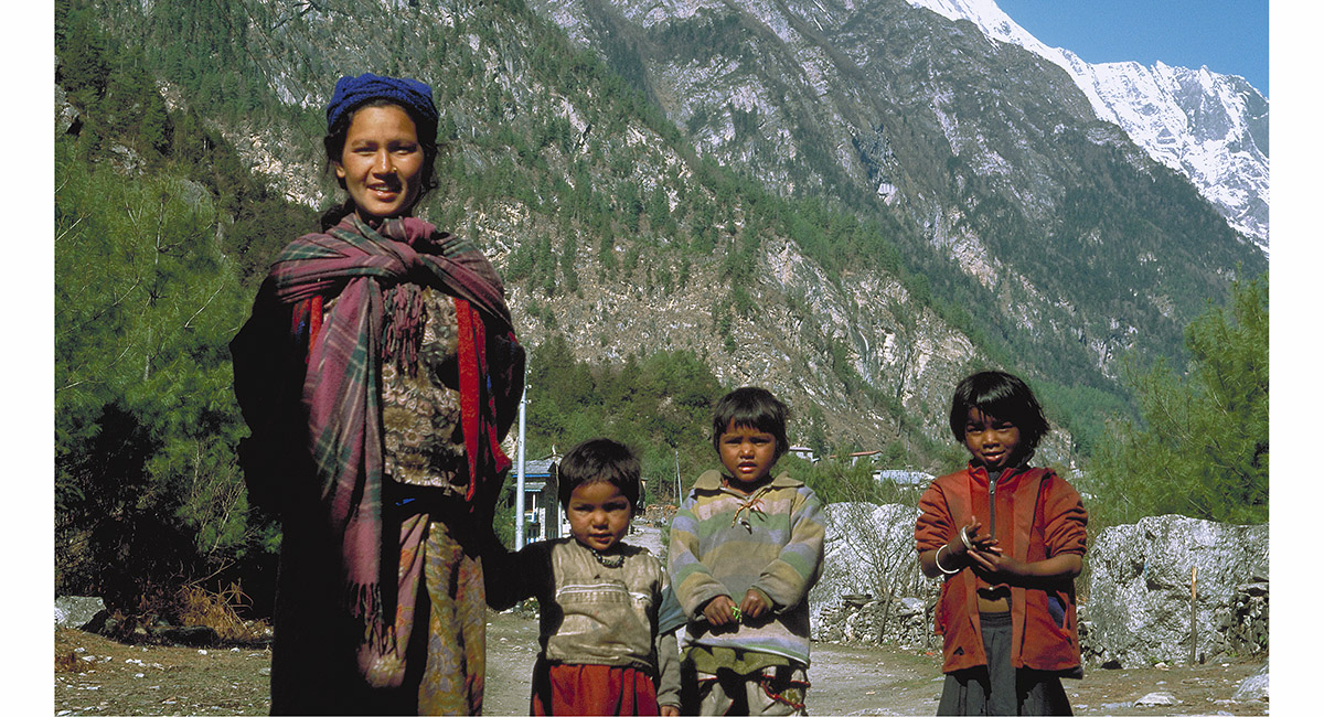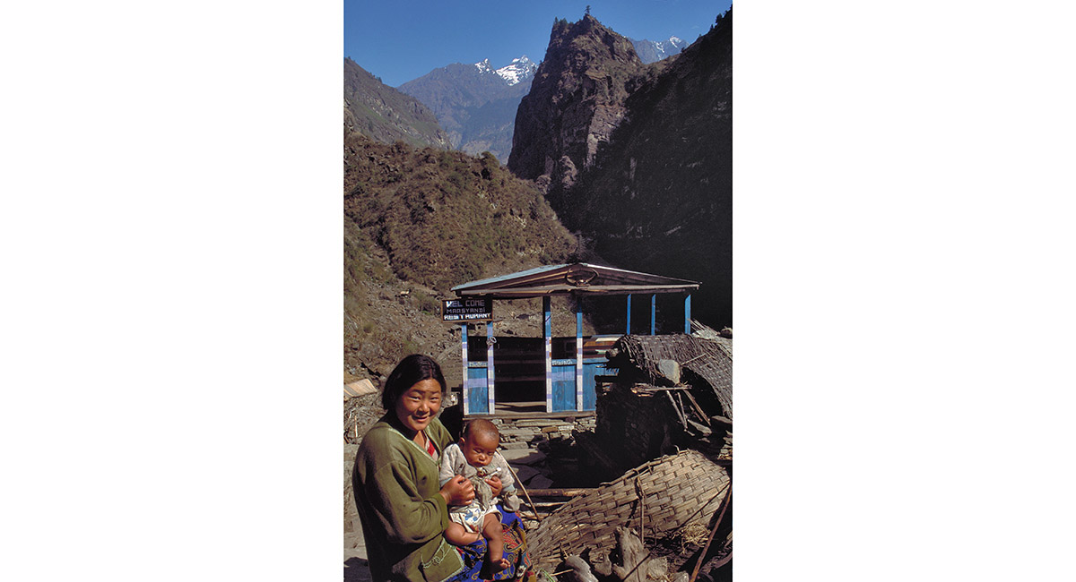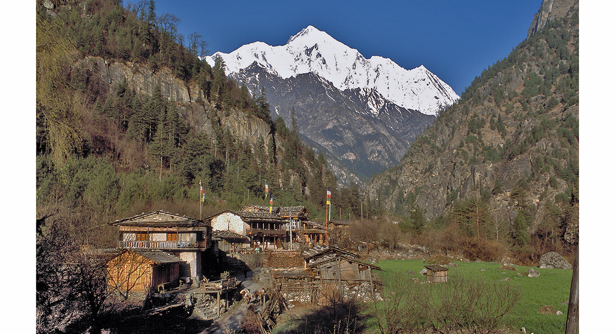 Approaching Kotho (2,550m), one of numerous small villages on the trail – a perfect spot for breakfast, with a fine view of Manaslu