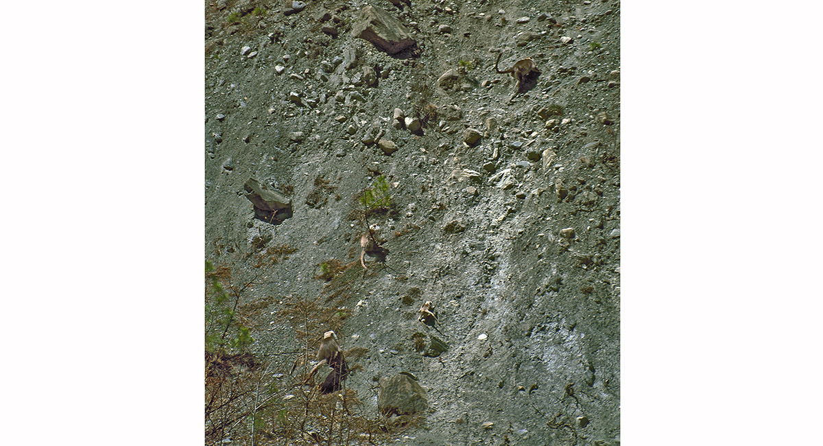 Langur monkeys scale an almost verticle cliff as though it was a Sunday stroll. These long-limbed creatures venture up to about 3,600m