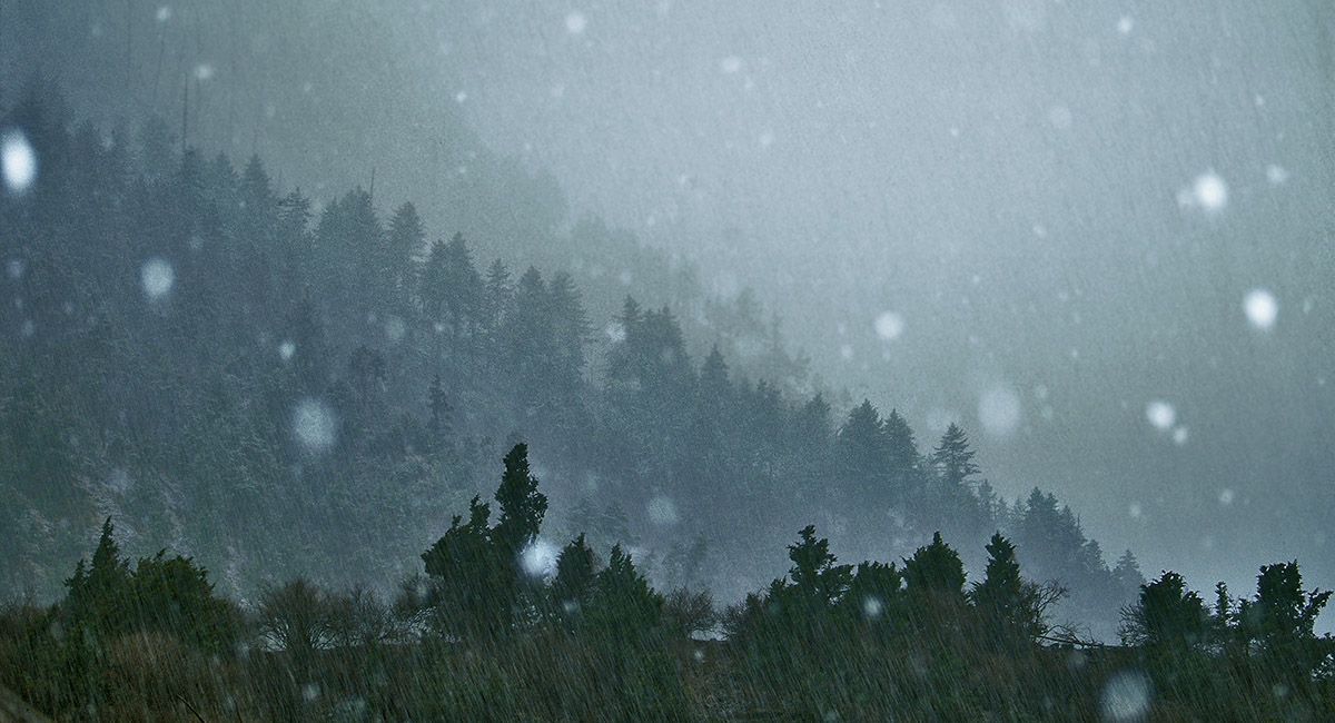 Bleak snowfall at dusk in lower Pisang (3,200m). In April the weather can change quickly and dramatically
