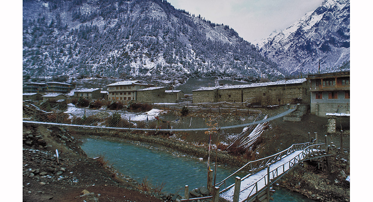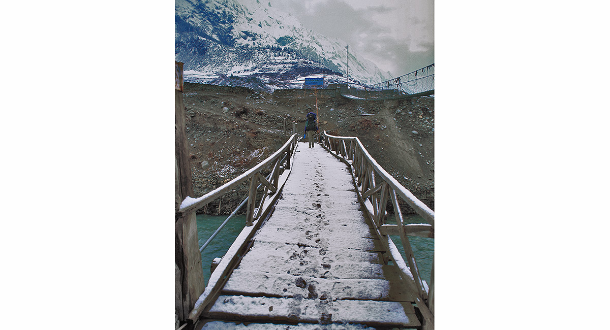 A wooden bridge spans the Marsyangdi Khola at lower Pisang