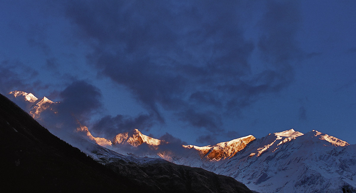 Dawn light on Dhaulagiri (8,167m), in this very foreshortened view from Kalopani (2,560m)