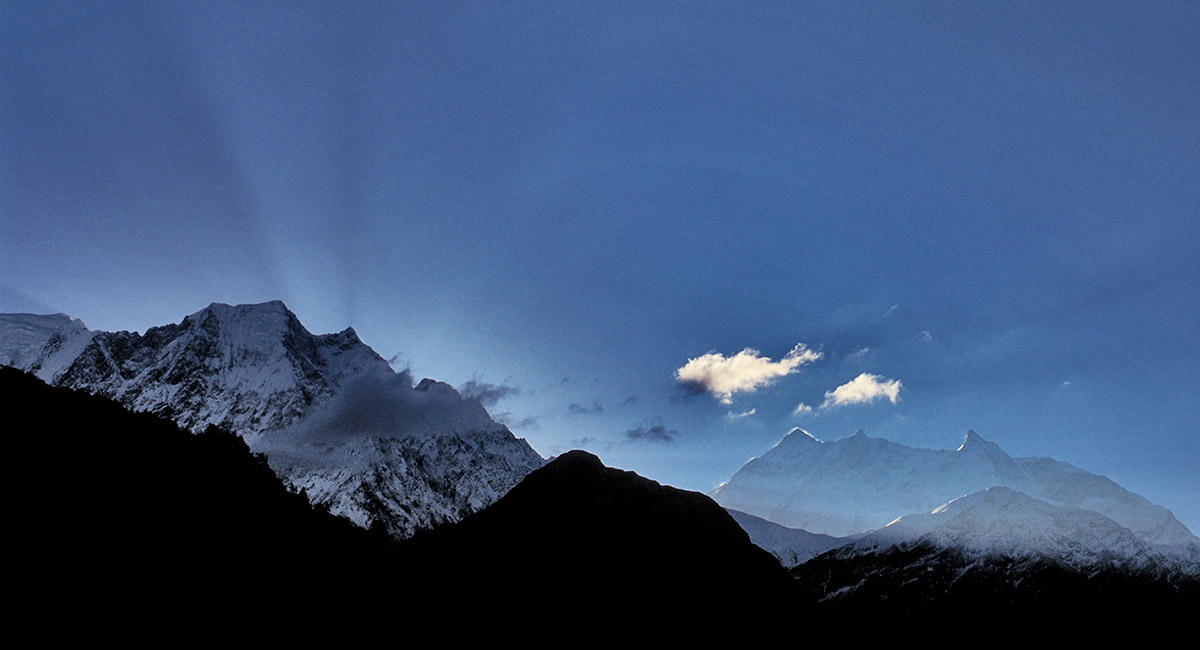 Annapurna South (7,219m), Hiunchuli (6,441m) and Machhapuchhare (6,997m), viewed from Poon Hill (3,000m) at dawn