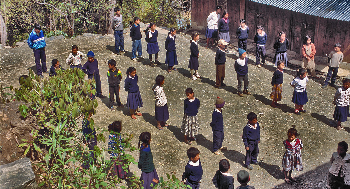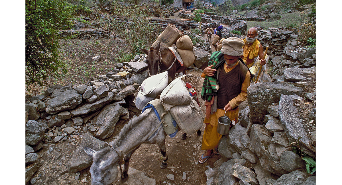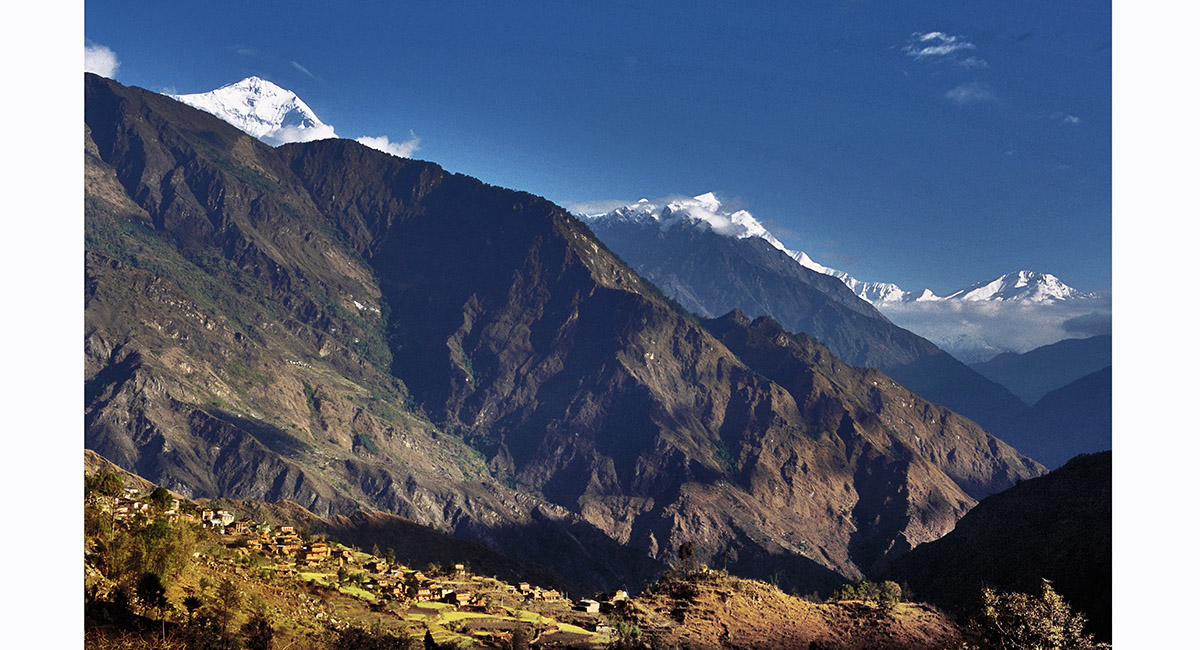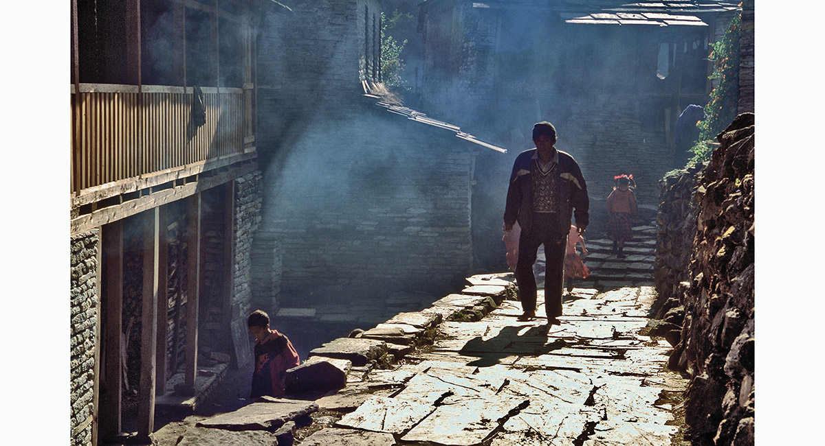 The main street of Kalopani is part of the Annapurna Circuit. Dhaulagiri looms up in the background