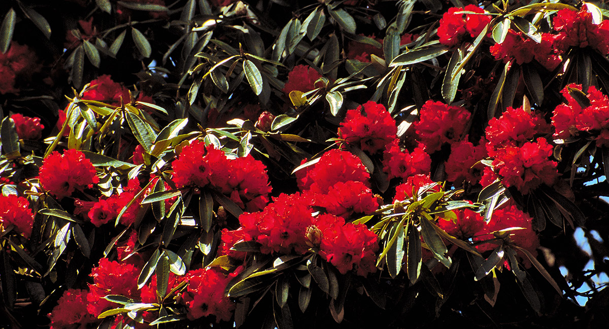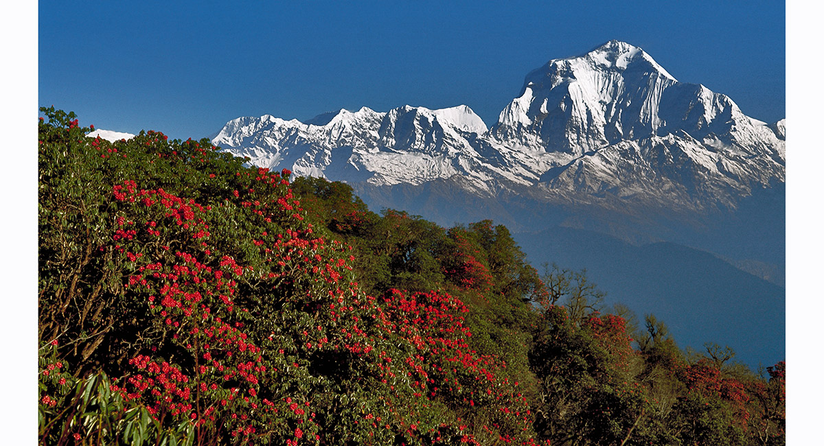 Dhaulagiri, with flowering rhododendron in the foreground, above Ghorapani