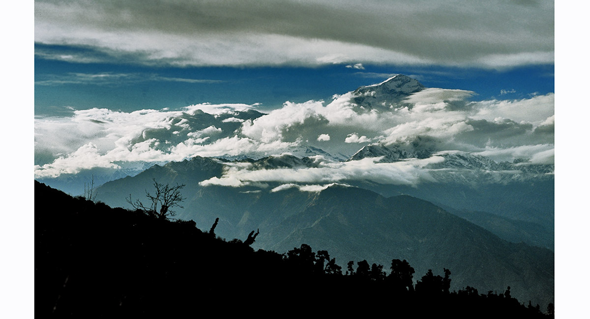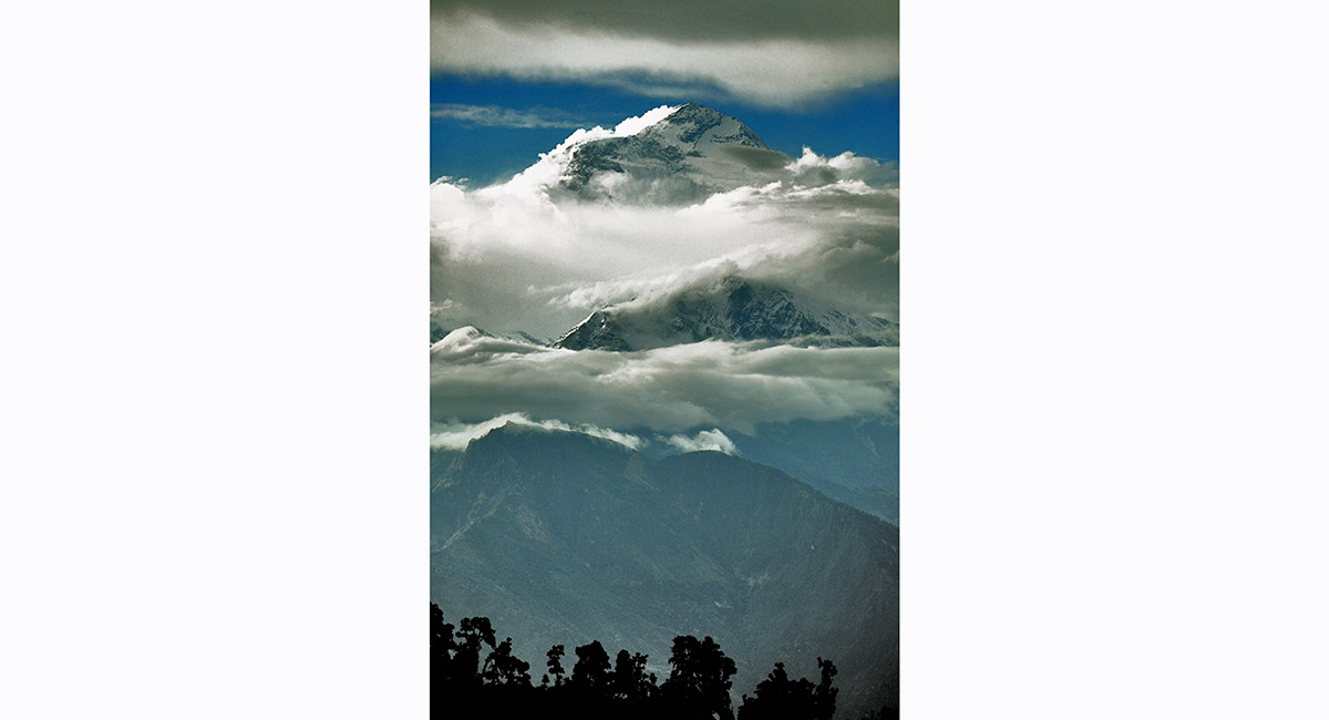 Part of the Annapurna massif, shrouded in cloud, from Ghorapani