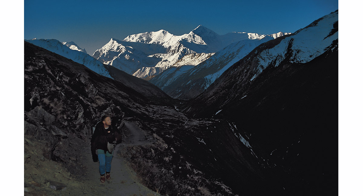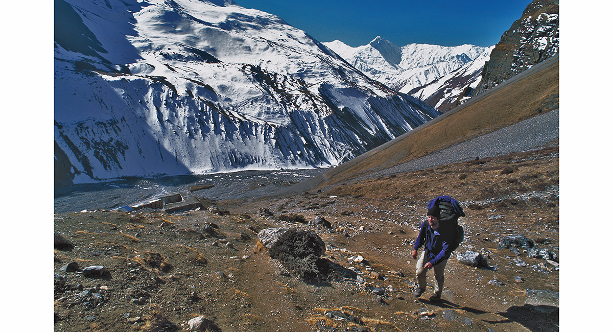 From above High Camp, a stupendous panorama back towards the Annapurnas and Manang stretches out. Somewhere below, a Himalayan Condor glides on wind currents deflected upwards by the mountain walls