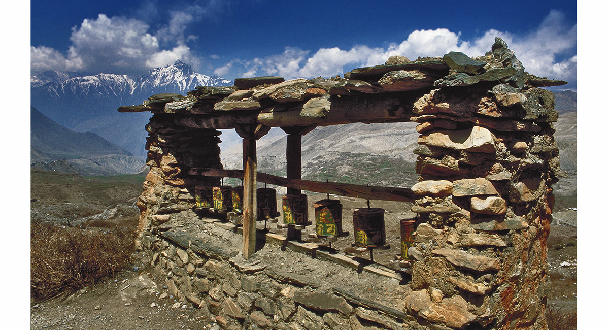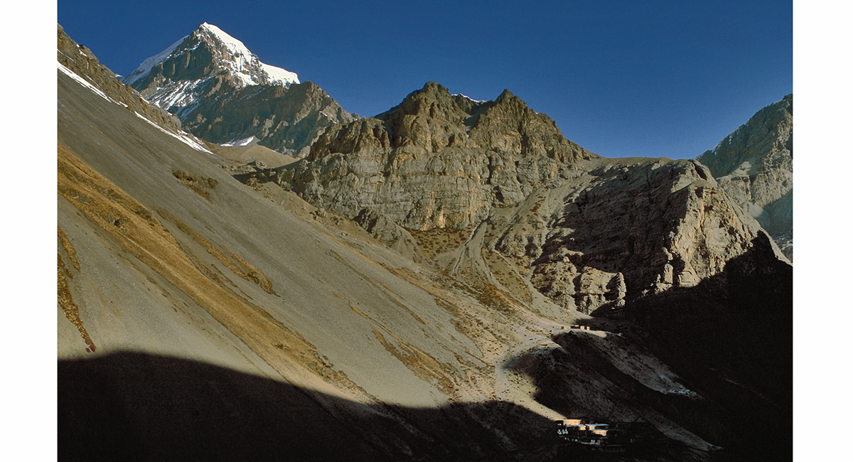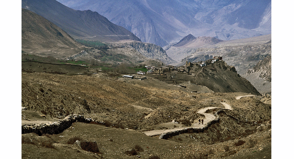From Muktinath the trail becomes a dirt road. This leads to Jharkot, an ancient village perched on a knife-edge ridge at 3,500m