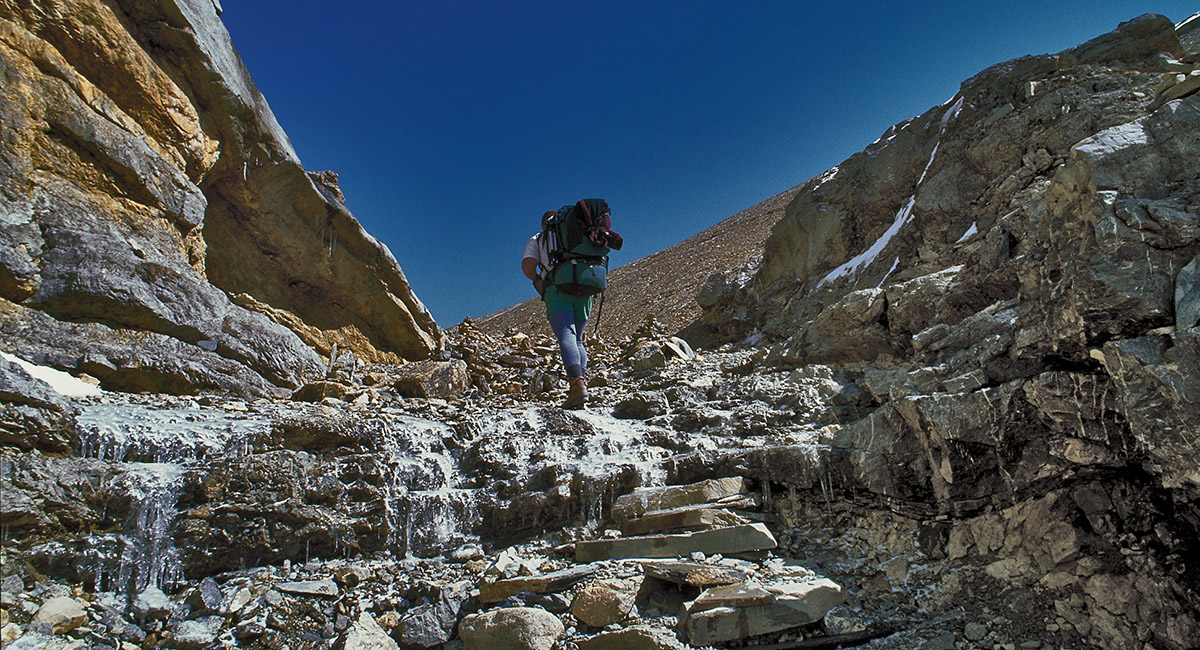 Passing a frozen stream just before reaching High Camp (4,775m)