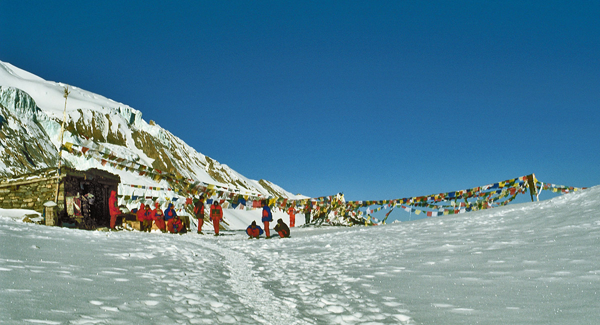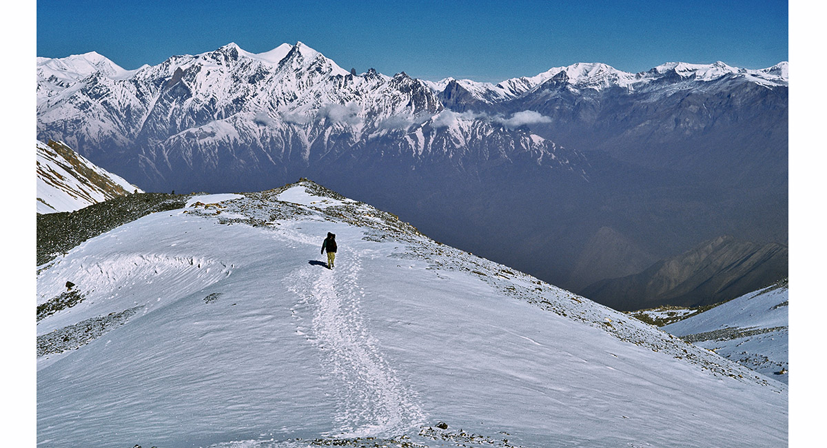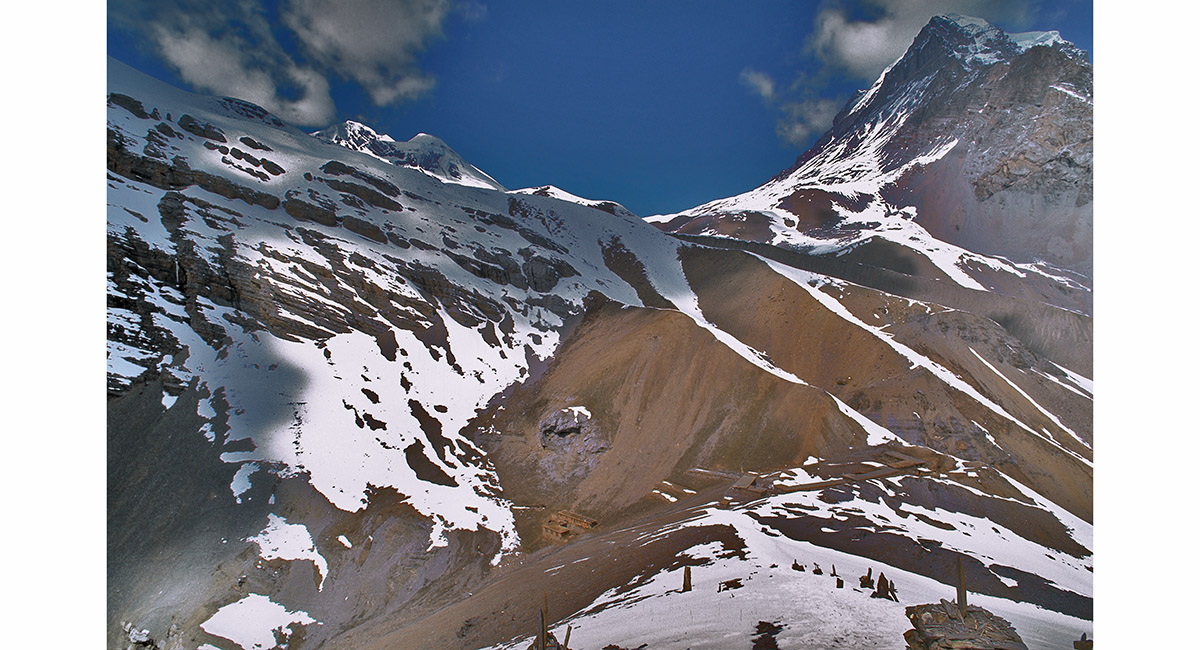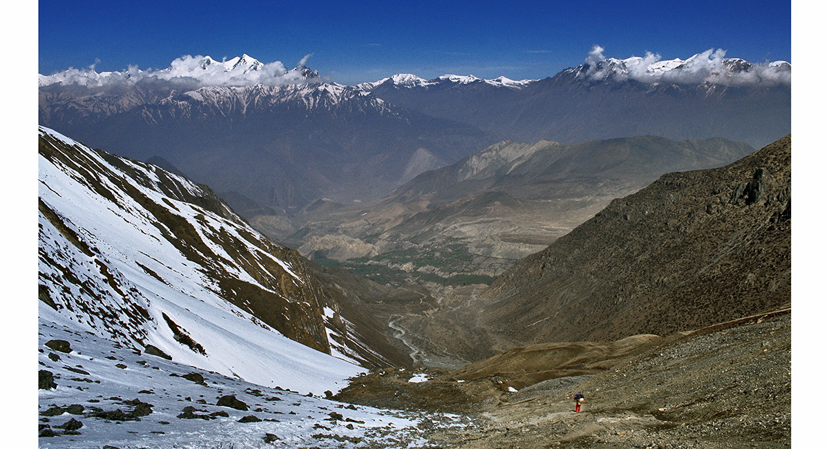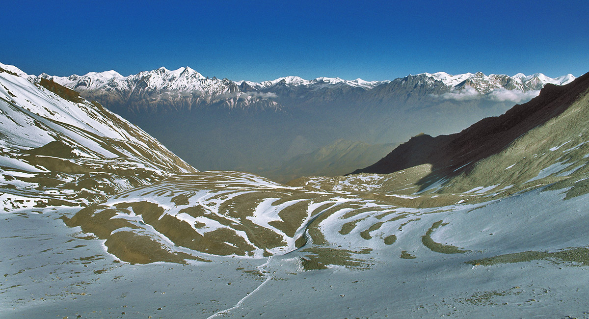 From a vantage point above High Camp, this view looks back to High Camp and the initial section of the snow-bound trail to Thorung La