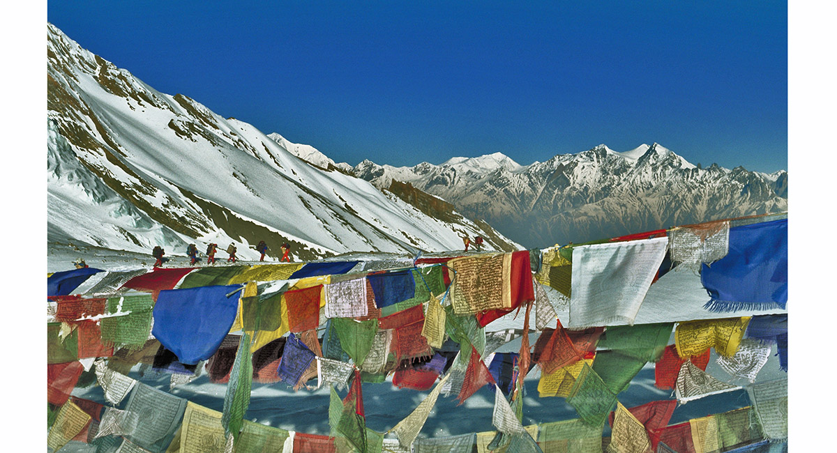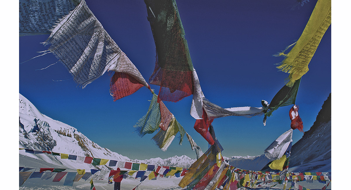 Weather beaten prayer flags chatter in the alpine breeze on Thorung La