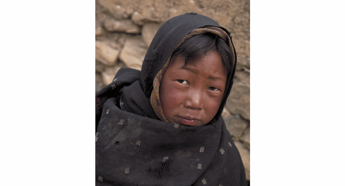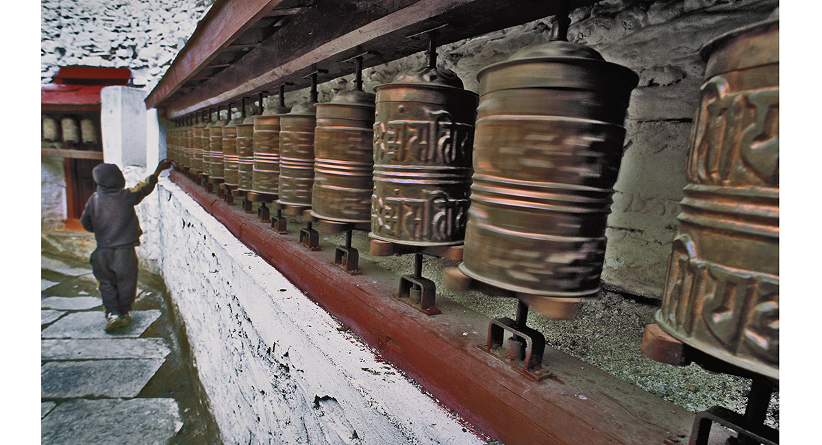 A young local boy gains his daily dose of merit by spinning prayer wheels at the base of Marpha Gompa