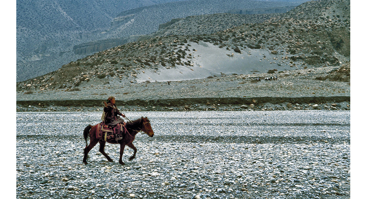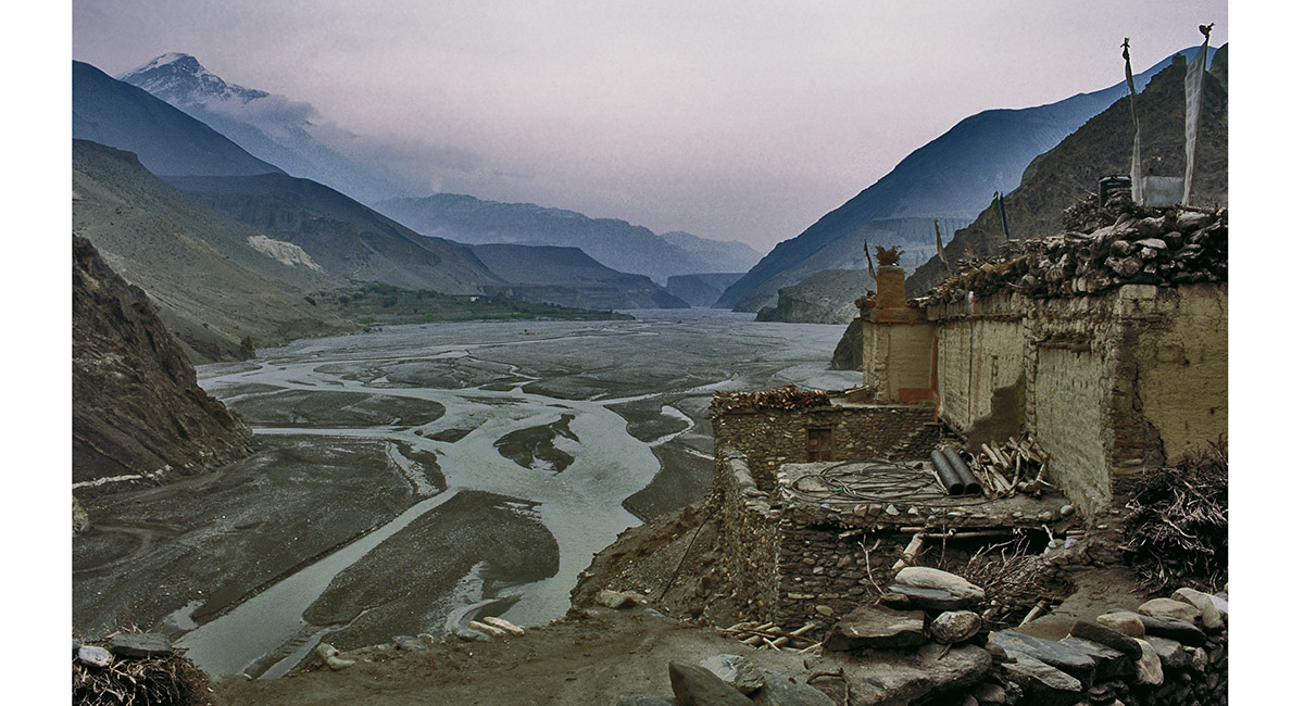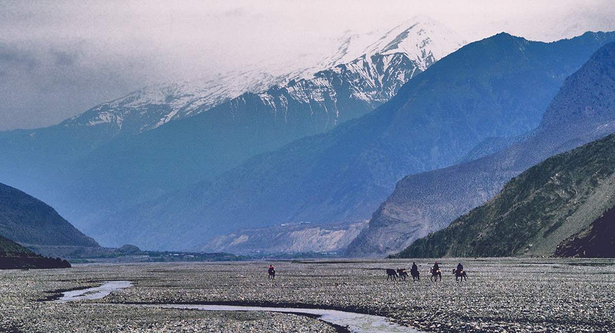 The trail below Kagbeni gradually descends beside the Kali Gandaki, sometimes undulating and other times crossing huge, stony river-flats. In the distance the huge flanks of Dhaulagiri rise into the clouds
