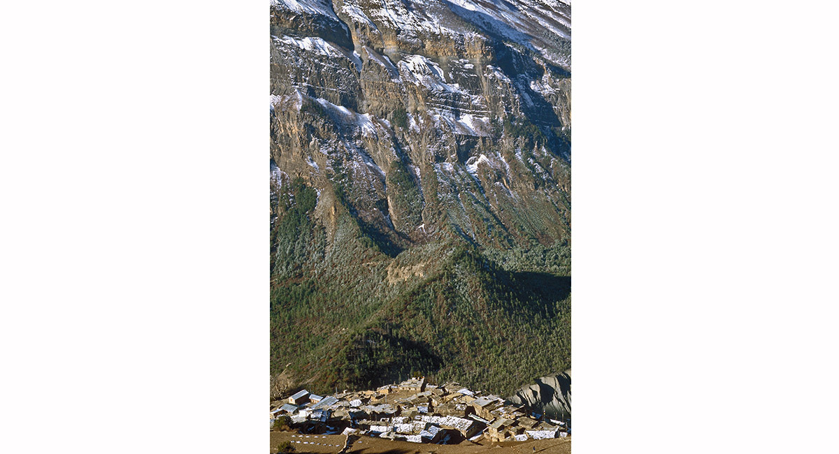 In the early evening after the children have gone home, Ghyaru primary school sits silently. Across the valley the Annapurna massif towers overhead