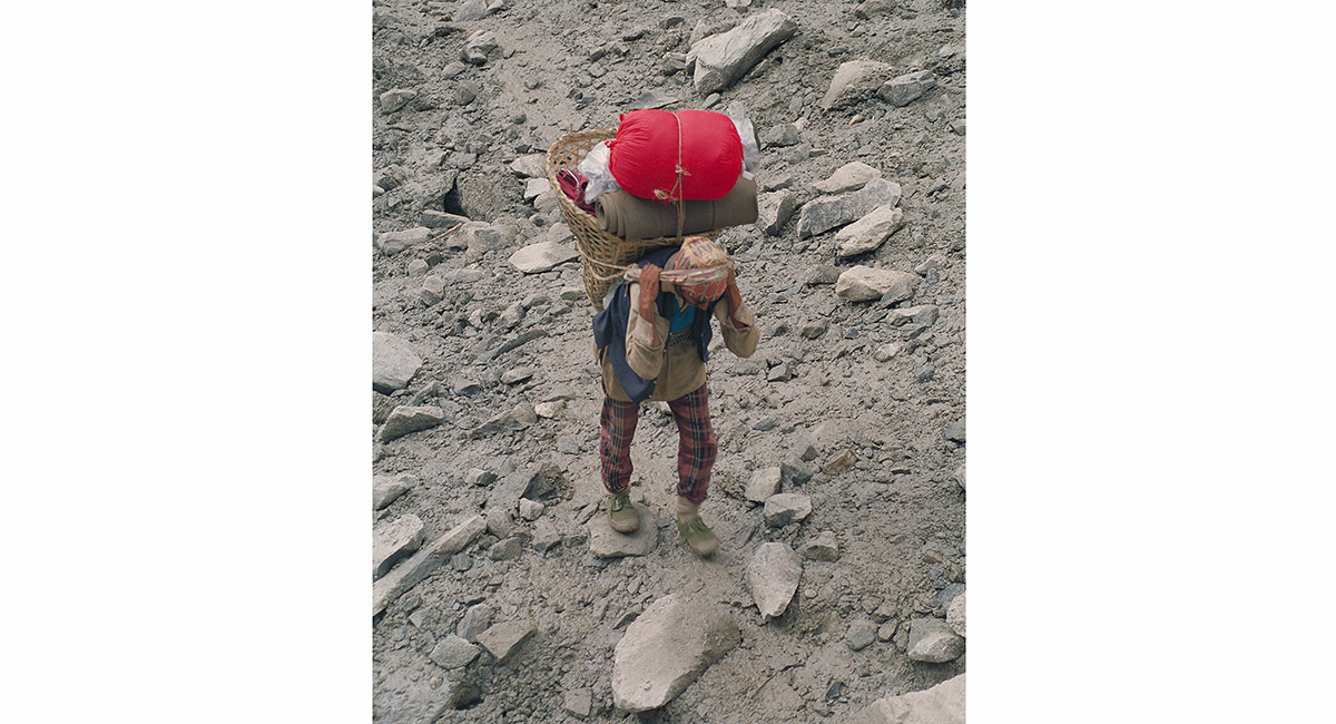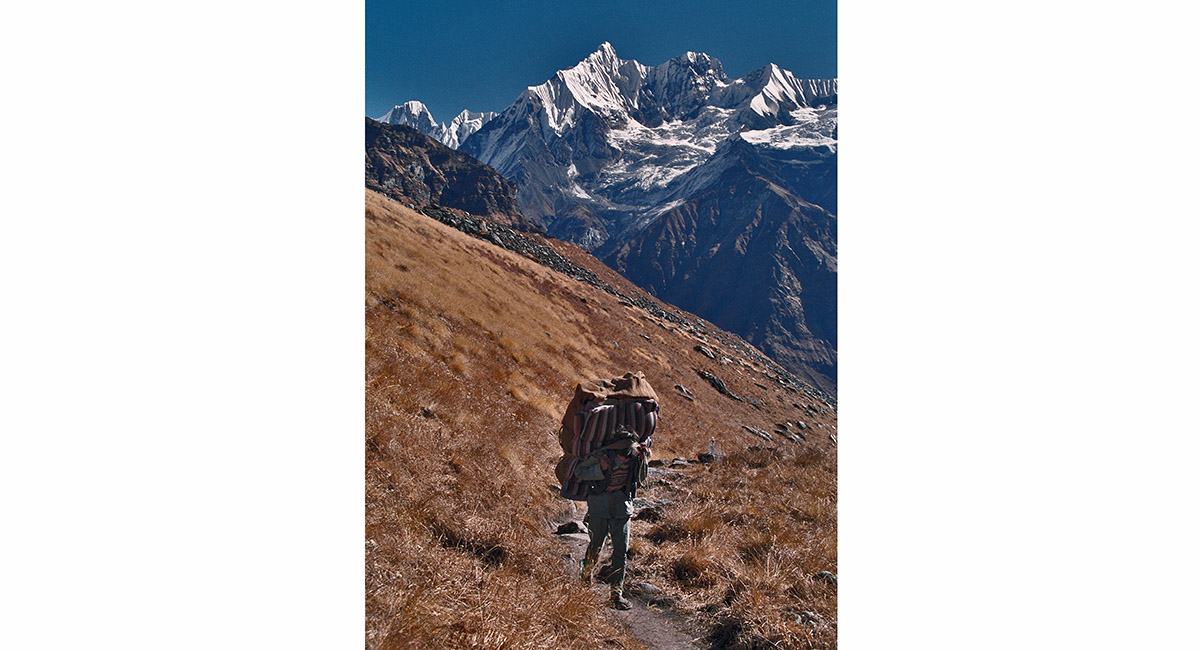 A porter heading up from Machhapuchhare base camp to Annapurna base camp