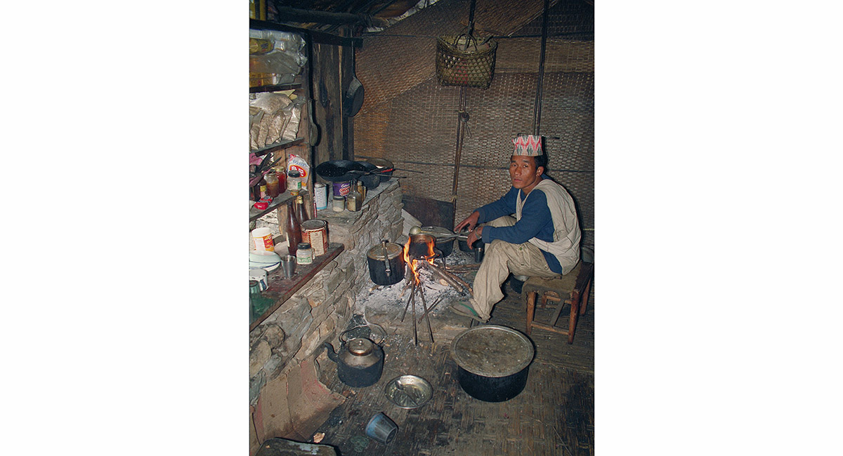 A Gurung man cooking at his tea house, near Hinko