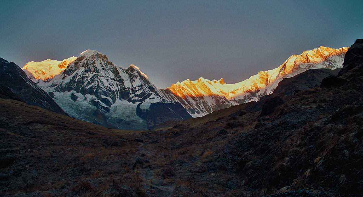 Annapurna South (left) and Annapurna I (8,091m) at dawn, between Machhapuchhare Base Camp (3,480m) and Annapurna Base Camp (3,900m)