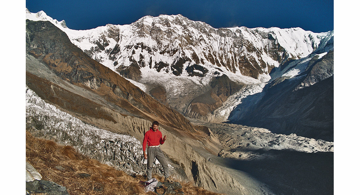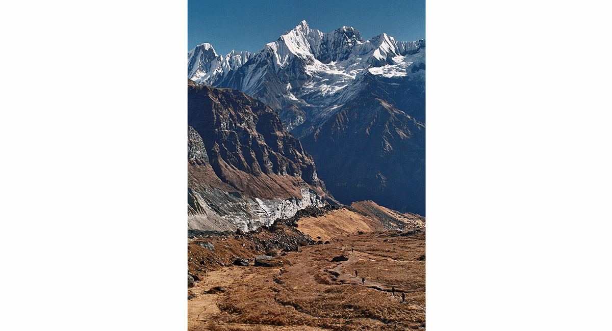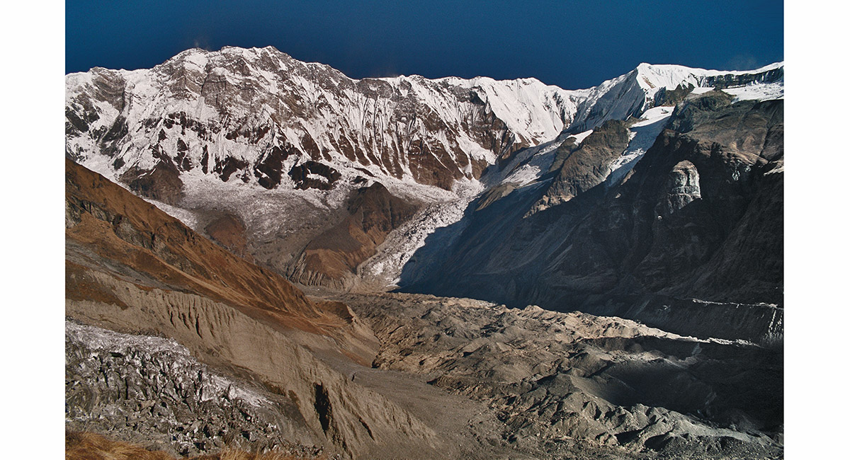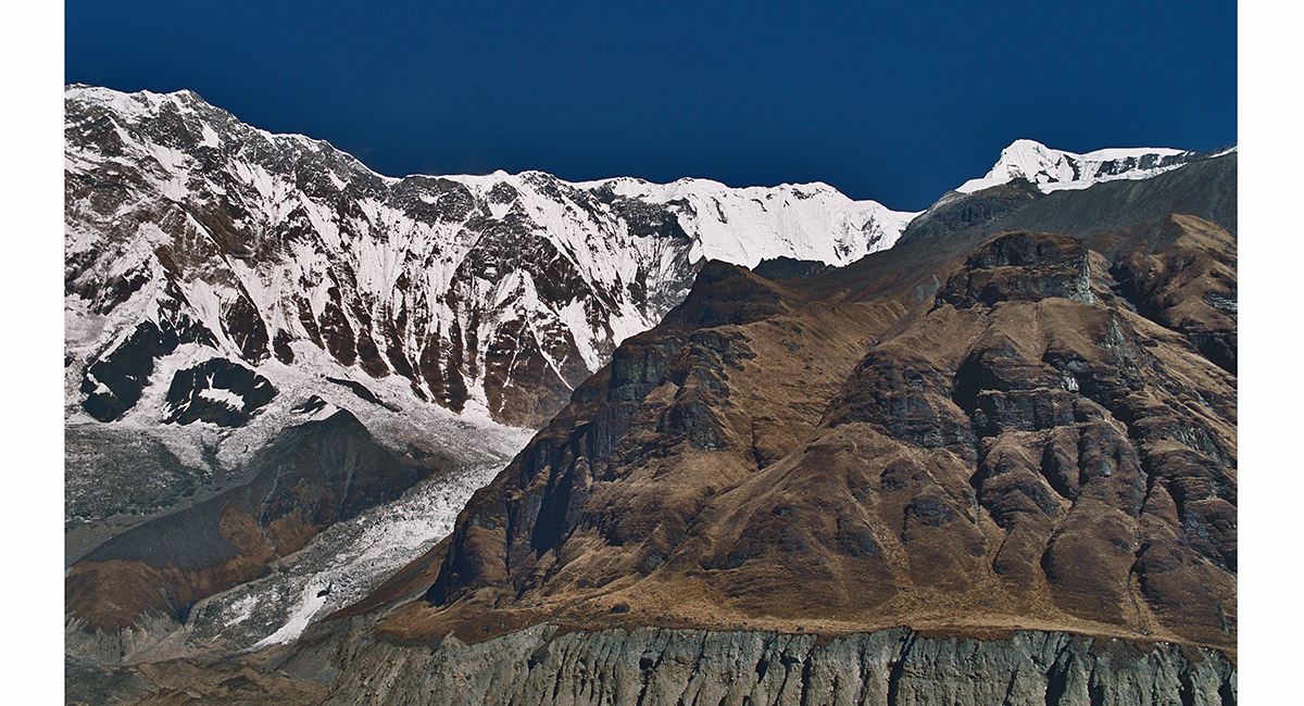 The massive wall linking Annapurna’s I and III, from above Base Camp