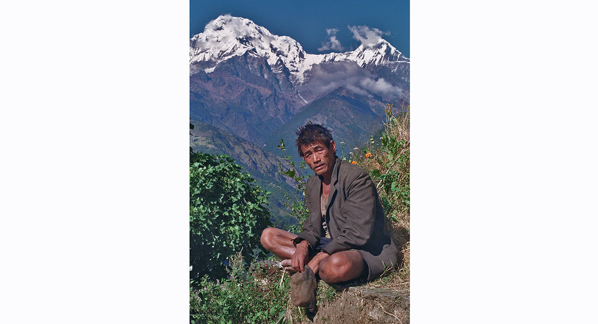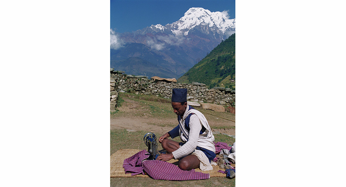 A Gurung man sewing, with Annapurna South behind, near Landrung