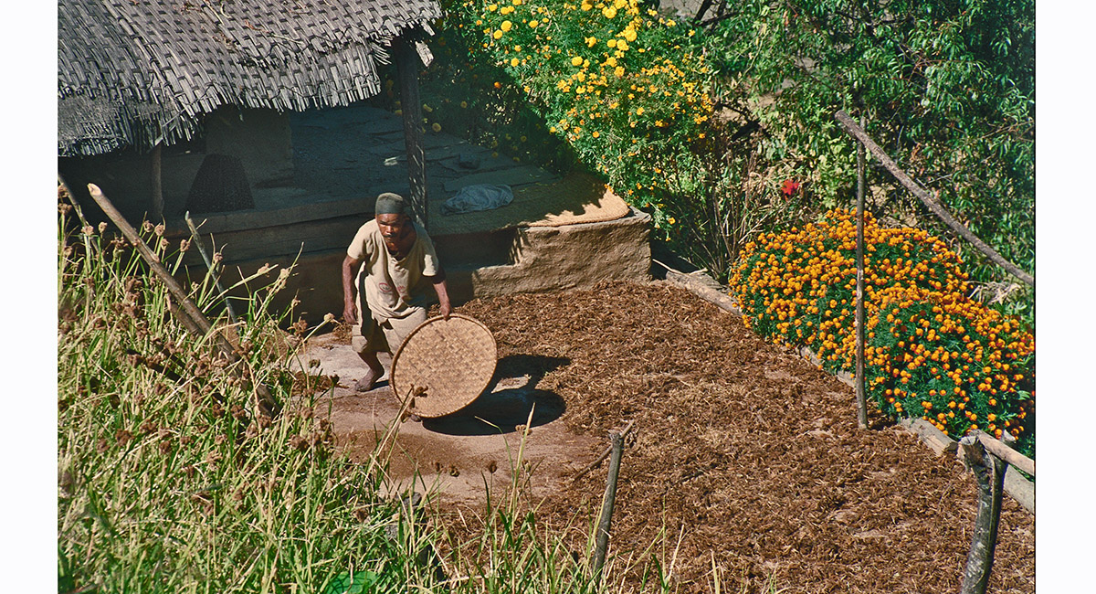 A Gurung woman sifting maize, near Landrung