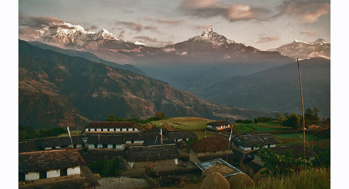 A panorama of Annapurna South, Hiunchuli and Machhapuchhare, viewed from Ghandrung (2,000 m)