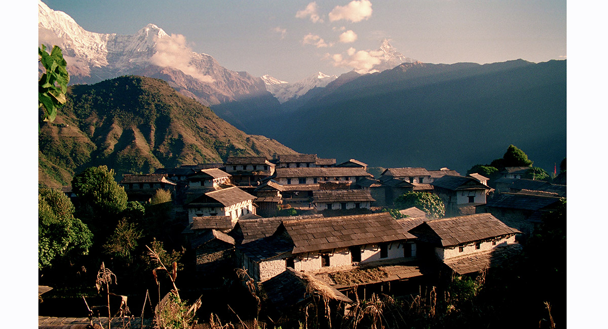 A closer look at the slate roofed houses of Ghandrung, with Annapurna South, Hiunchuli and Machhapuchhare behind