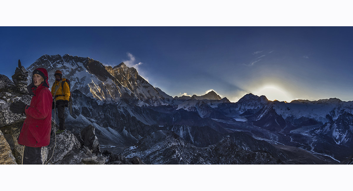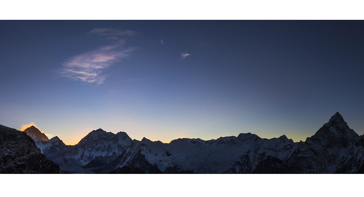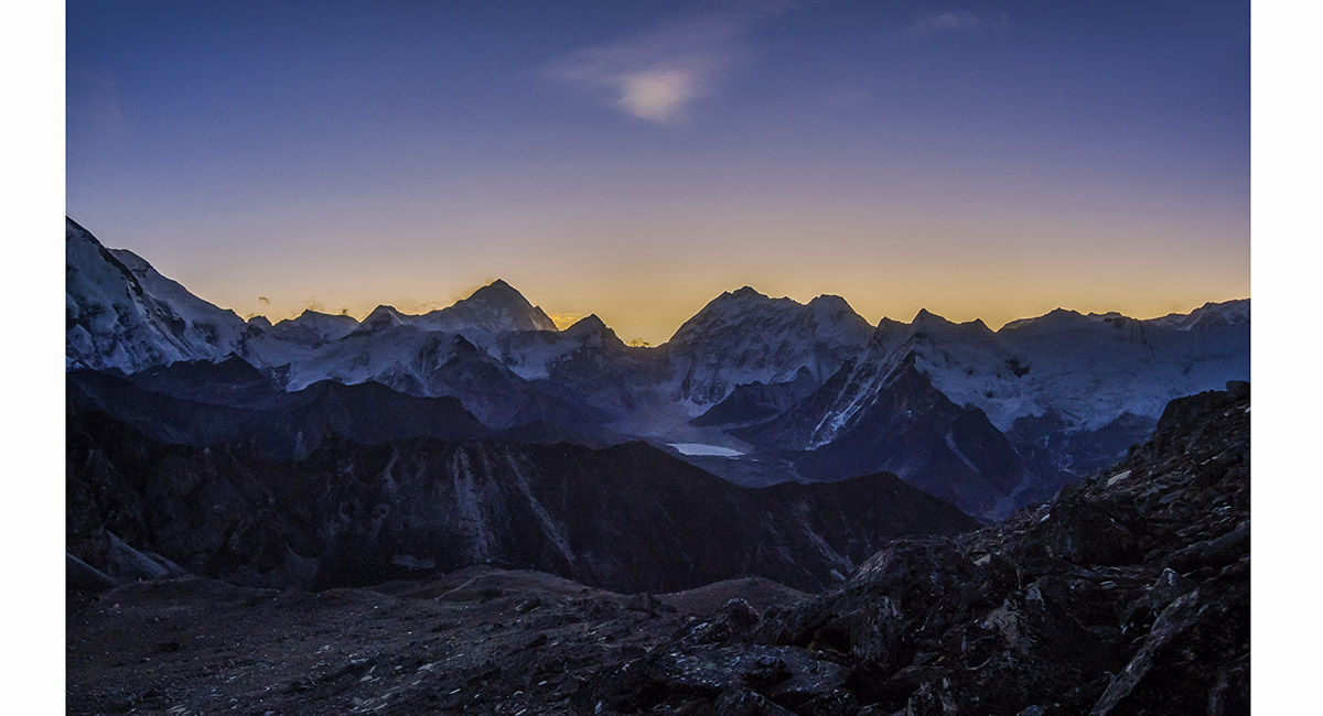 Sunrise from about 5,600m. Sunlight illuminates the big boys first - Makalu and Lhotse