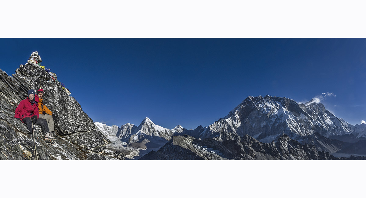 Taking it all in just below the summit of Pokhalde. Further right are Pumori, Lingtren, Khumbutse, Nuptse and Lhotse