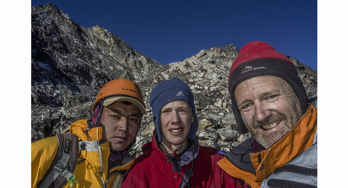 On the summit of Pokhalde (5,806m) on Ed's 15th birthday. Nuptse, Lhotse and Lhotse Shar bear silent witness
