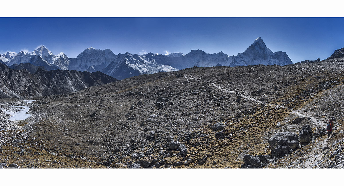Another wide view on the descent from Kongma La. Lhotse is at left, with Imja Tse the dark peak standing out more clearly to its right, on the skyline