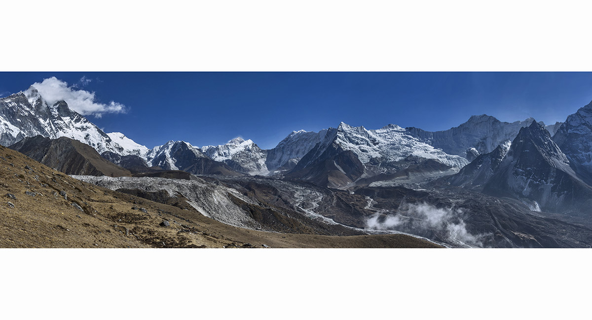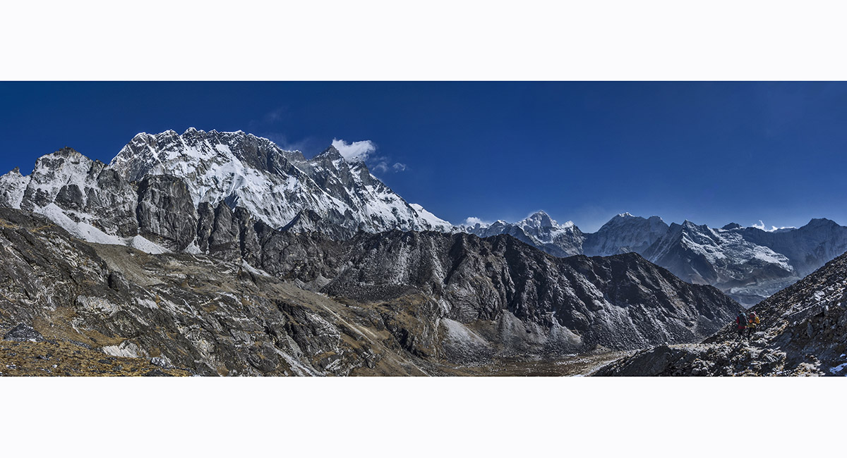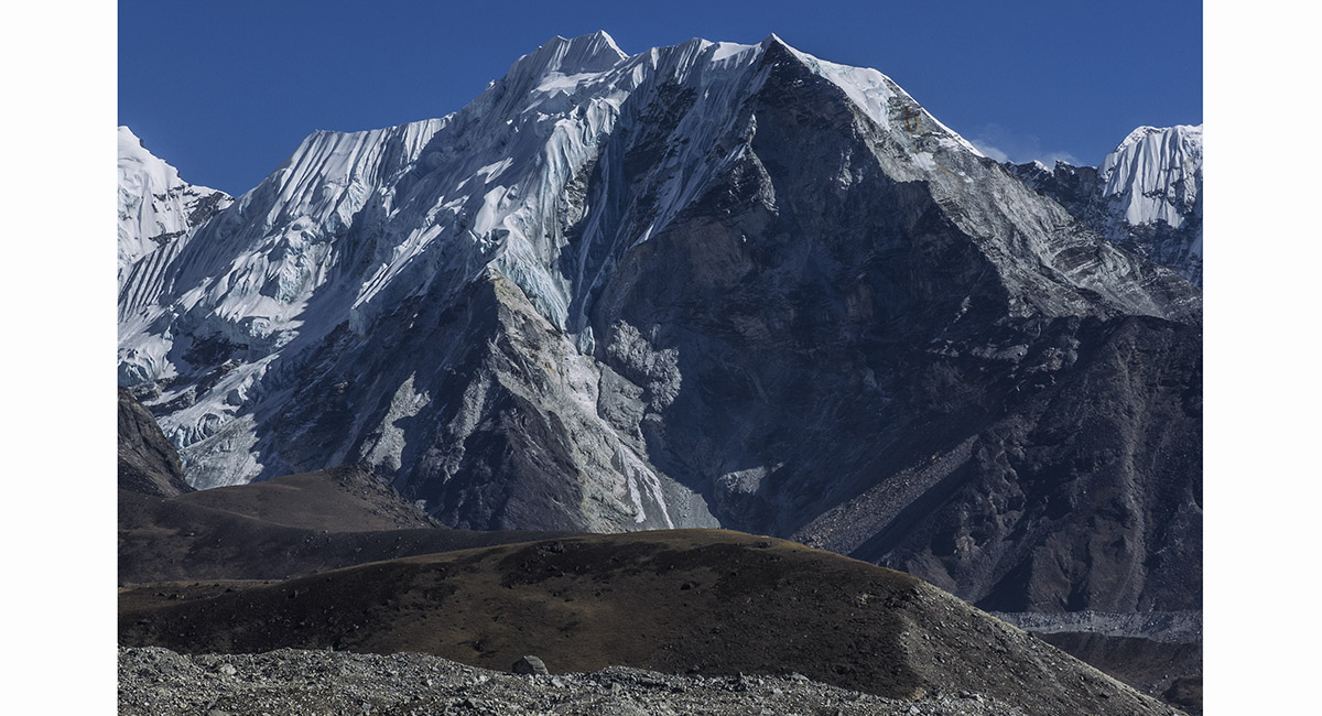 A view north to Nuptse and Lhotse. The huge rock cliffs stretch down right from Nuptse, over Chhukung peak and Ri, to Chhukung village